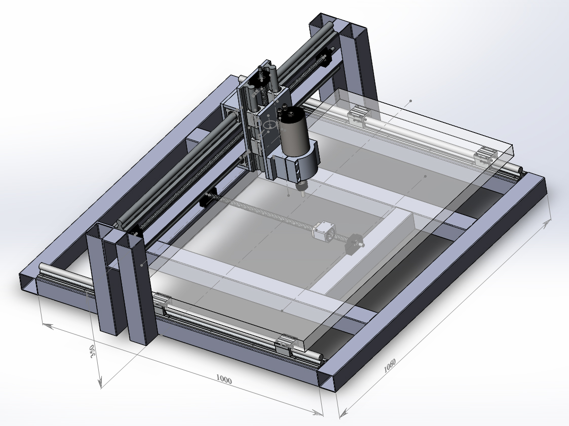 Есть идея собрать невысокобюджетный станок из китайских запчастей с алиекспресса. Моторы нема23-28кг/с, шпиндель 2.2КВт ЕР20 с водяным охлаждением, ШВП 1605, рельсы SBR20. Пока ориентируемся на металлопрофиль 60х60х2мм. Набросок в солиде в приложенных скринах. Длинная ось с кареткой будет внутри металлического швеллера. Допуски металлопроката нам известны, конечно, потому вопрос: имеет ли смысл использовать алюминиевый конструкционный профиль или еще что-то? При этом массу станка терять не хотелось бы, уже был опыт сборки довольно жидкого и легкого станка. Каких трудностей при сборке и в дальнейшей эксплуатации ожидать? Насколько вообще жизнеспособна наша схема? Спасибо.
