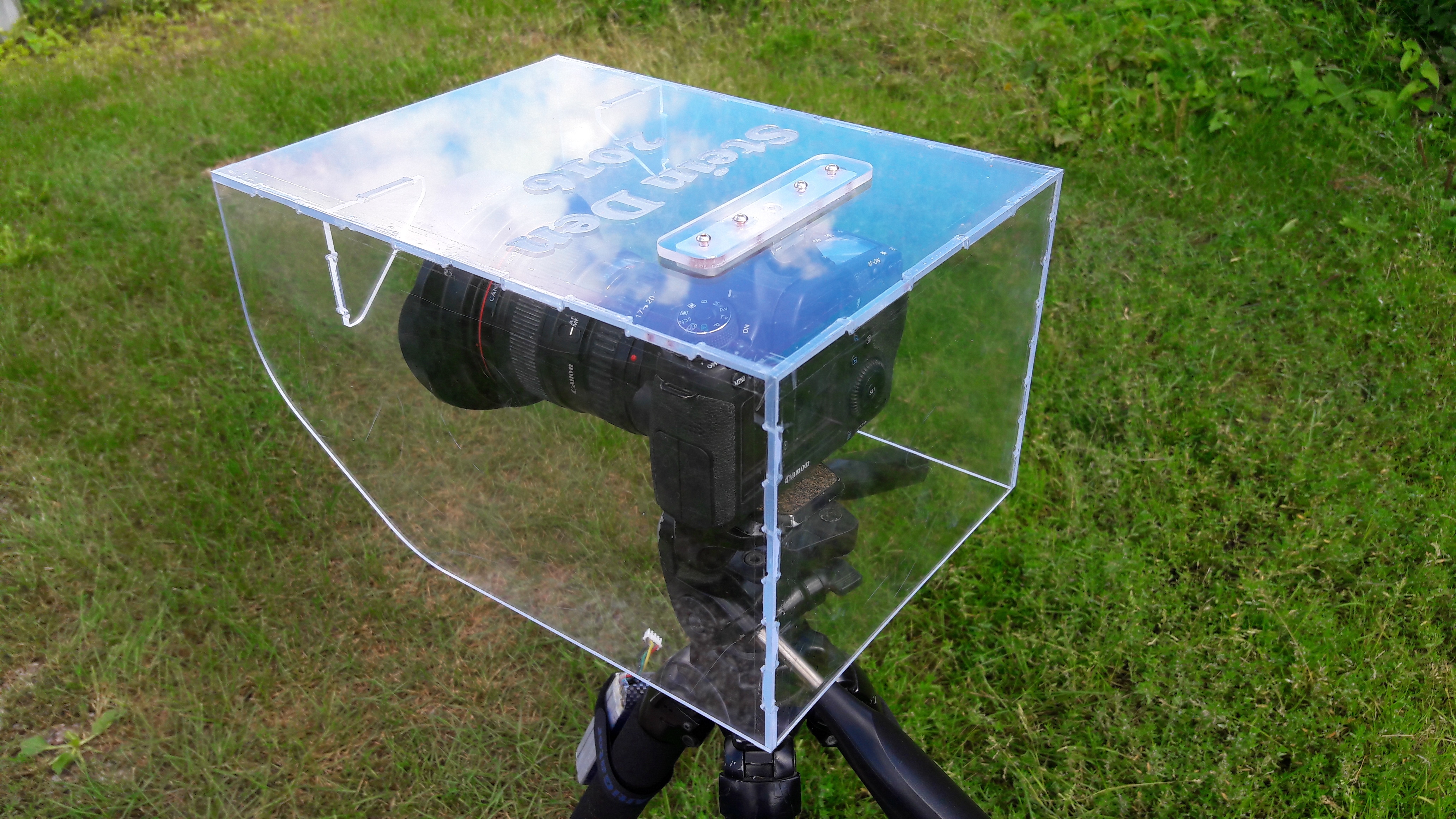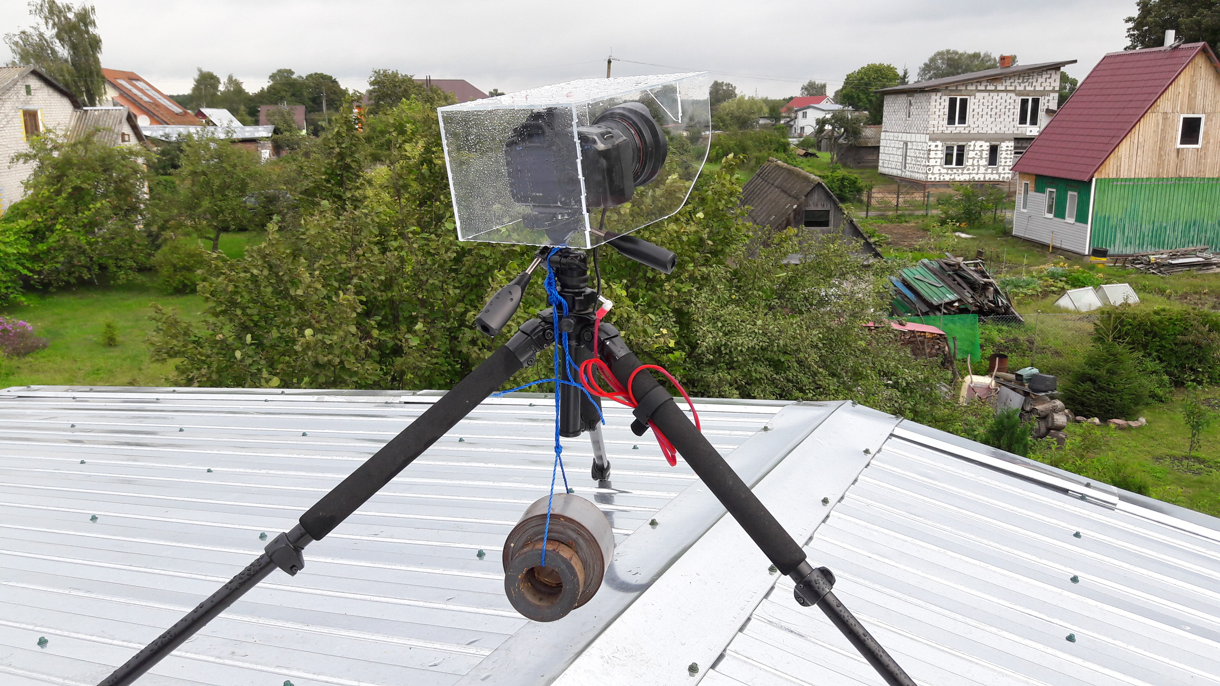 Для 18-ти часовой съемки на открытом воздухе, я изготовил из 4мм оргстекла всепогодный домик для камеры с объективом. Размеры домика оптимизированы для съемки начиная с фокусного расстояния 17мм для 35мм сенсора, так чтобы в кадр не попадала конструкция домика. Домик должен защитить электронику от воздействия влаги. Данное изделие монтируется на камеру одним движением руки - на горячий башмак. Кроме того, сделал модуль внешнего питания для камеры на DC\DC преобразователе. Таким образом, камера может работать сколько угодно долго. На первой же съемке за 18 часов камера три раза подвергалась удару стихии - дождю, на видео это видно. Камера и объектив остались сухими. Тест можно сказать пройден. Естественно, домик с камерой монтировались по ветру, иначе косой дождь частично зальет переднюю линзу объектива.