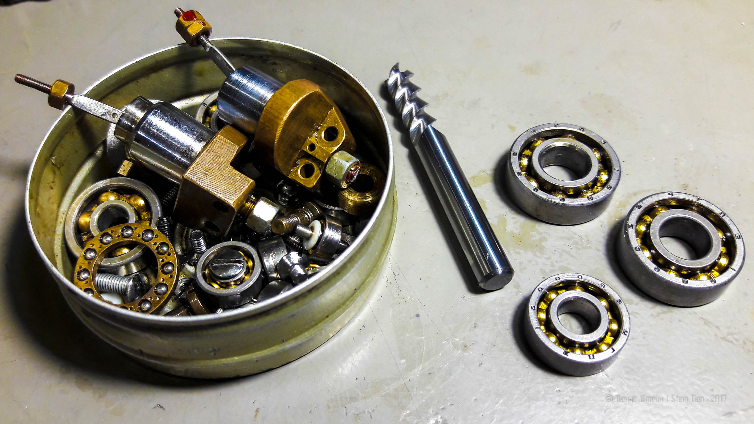 Для датчика длины я выбрал сломанную карбидную фрезу 6мм. В отличии от советских фрез, она вся полированная и самое главное - торец хвостика очень ровный и выполнен под 90 градусов к телу фрезы. Без специальных приспособлений я вряд ли смог бы сделать абсолютно перпендикулярный рез вала или фрезы, а для датчика длины инструмента это крайне важно, так как это будет измерительная плоскость, пусть и небольшого диаметра . Покупал я эту фрезу на Ebay. Кончик фрезы получил скол при сбое калибровки длины инструмента об брусок дюрали. Фреза отлично вставляется в советский подшипник и плавно двигается в нем, без малейшего люфта.