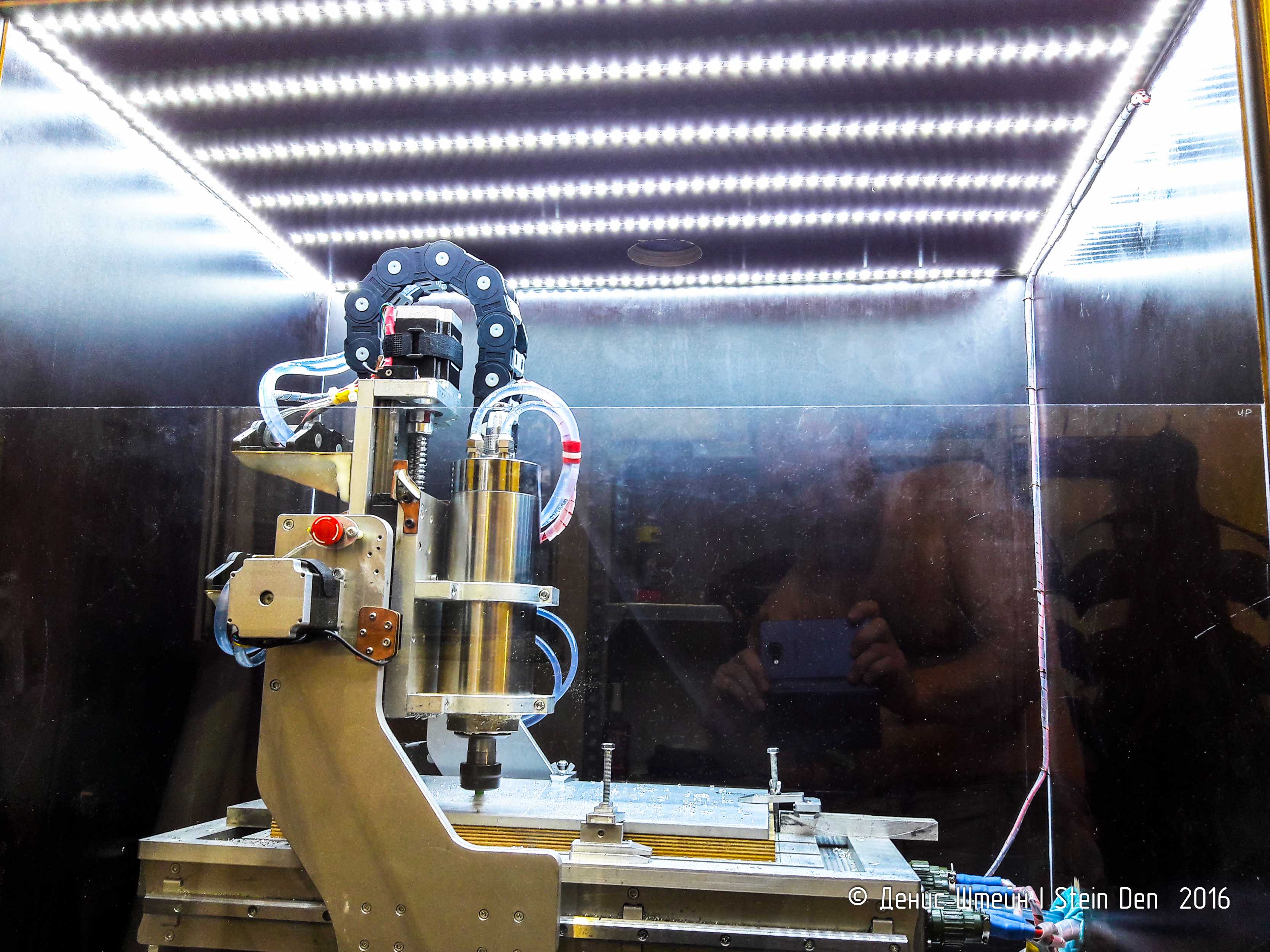 По мере появления свободного времени, работаю на станке. Конструкция со шкафом заметно упростила жизнь. Теперь стружка не летит во все стороны. В потолке шкафа сделал освещение - наклеил полоски светодиодных лент. Теперь освещение равномерно заливает весь объем шкафа, резкие тени отсутствуют.