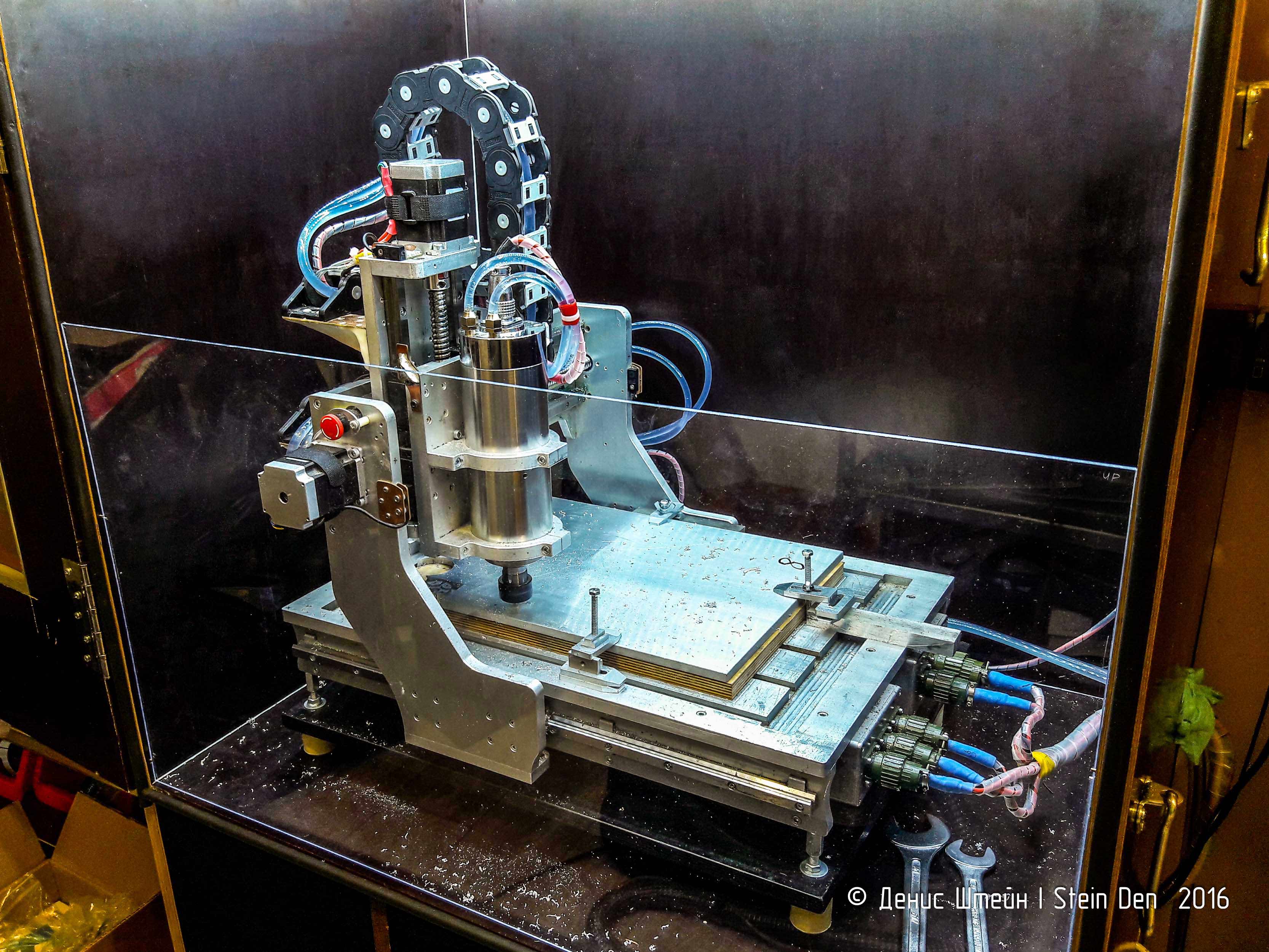 Защитный экран не дает разлетаться стружке, даже тогда, когда станок работает с открытой дверцей. После работы я просто прохожу пылесосом с аквафильтром под стеклом и затем внутри шкафа, убрав стекло. Теперь носки чистые от алюминиевой стружки и пыли :hehehe: