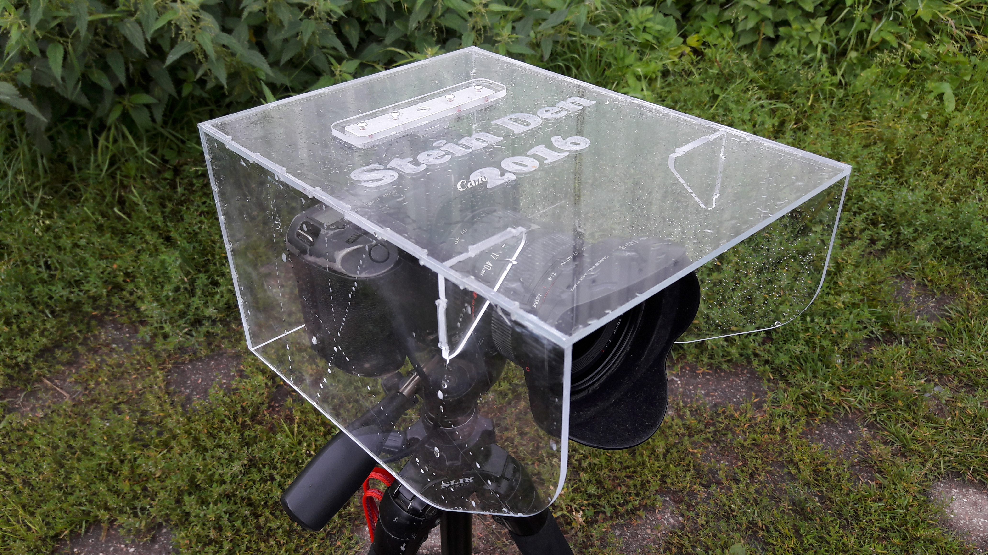 Для 18-ти часовой съемки на открытом воздухе, я изготовил из 4мм оргстекла всепогодный домик для камеры с объективом. Размеры домика оптимизированы для съемки начиная с фокусного расстояния 17мм для 35мм сенсора, так чтобы в кадр не попадала конструкция домика. Домик должен защитить электронику от воздействия влаги. Данное изделие монтируется на камеру одним движением руки - на горячий башмак. Кроме того, сделал модуль внешнего питания для камеры на DC\DC преобразователе. Таким образом, камера может работать сколько угодно долго. На первой же съемке за 18 часов камера три раза подвергалась удару стихии - дождю, на видео это видно. Камера и объектив остались сухими. Тест можно сказать пройден. Естественно, домик с камерой монтировались по ветру, иначе косой дождь частично зальет переднюю линзу объектива.
