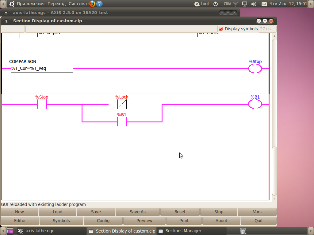 там есть такие штуки ---(S)- set и ---(R)- reset.T00T писал(а):2. Как в laddr'e сделать D-триггер, короче нужно, что бы сигнал защёлкивался при кратковременном подаче сигнала на вход, и чтоб другим сигналом его можно было бы сбросить.