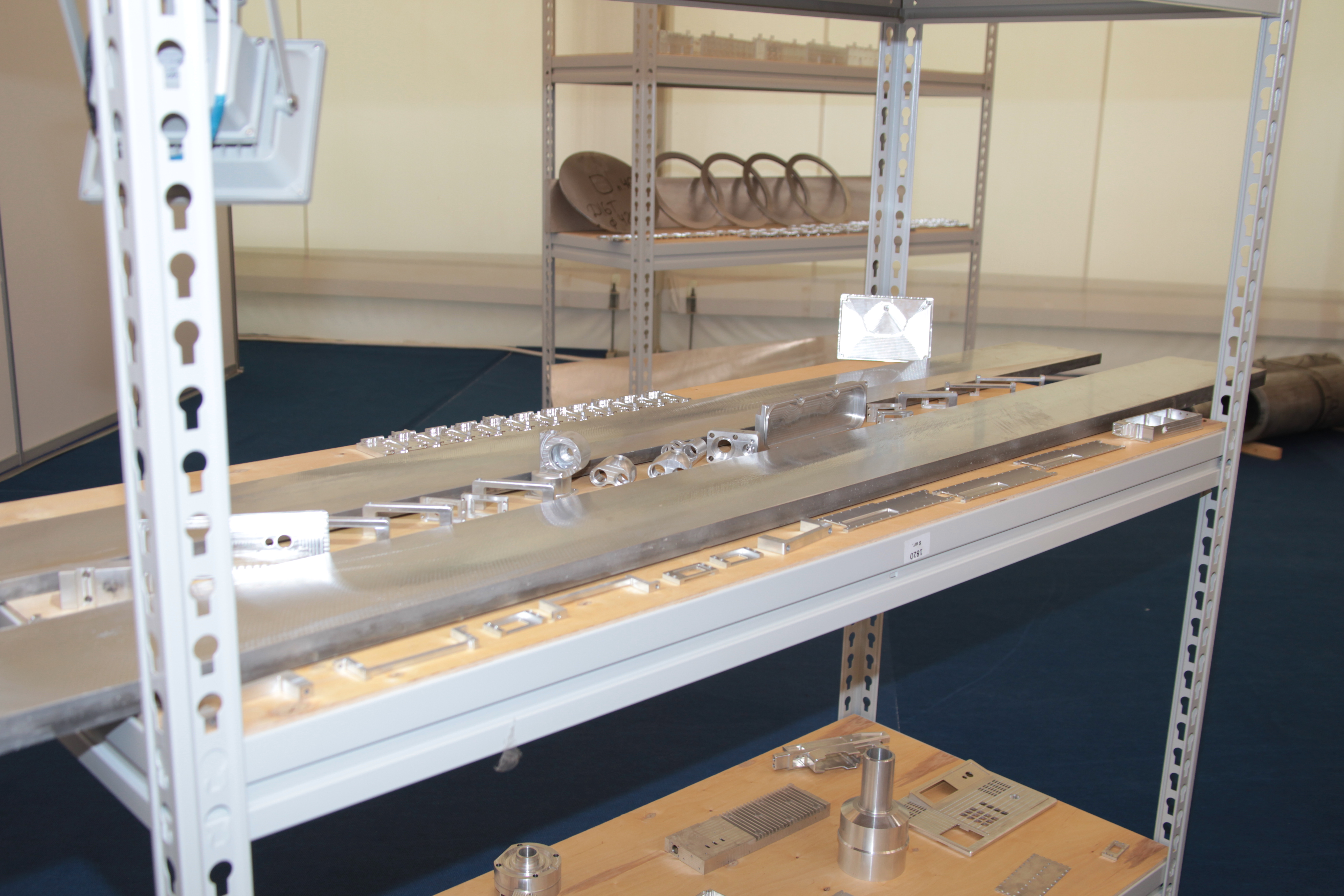 На полки внизу положили крупногабаритные заготовки из алюминиевых сплавов, повыше--поменьше, верхние под мелочёвку и детали изготовленные на cnc-станках (ЧПУ). Самые верхние--просто как крыша. Очень много возились со светом, не только стеллажи освещали.