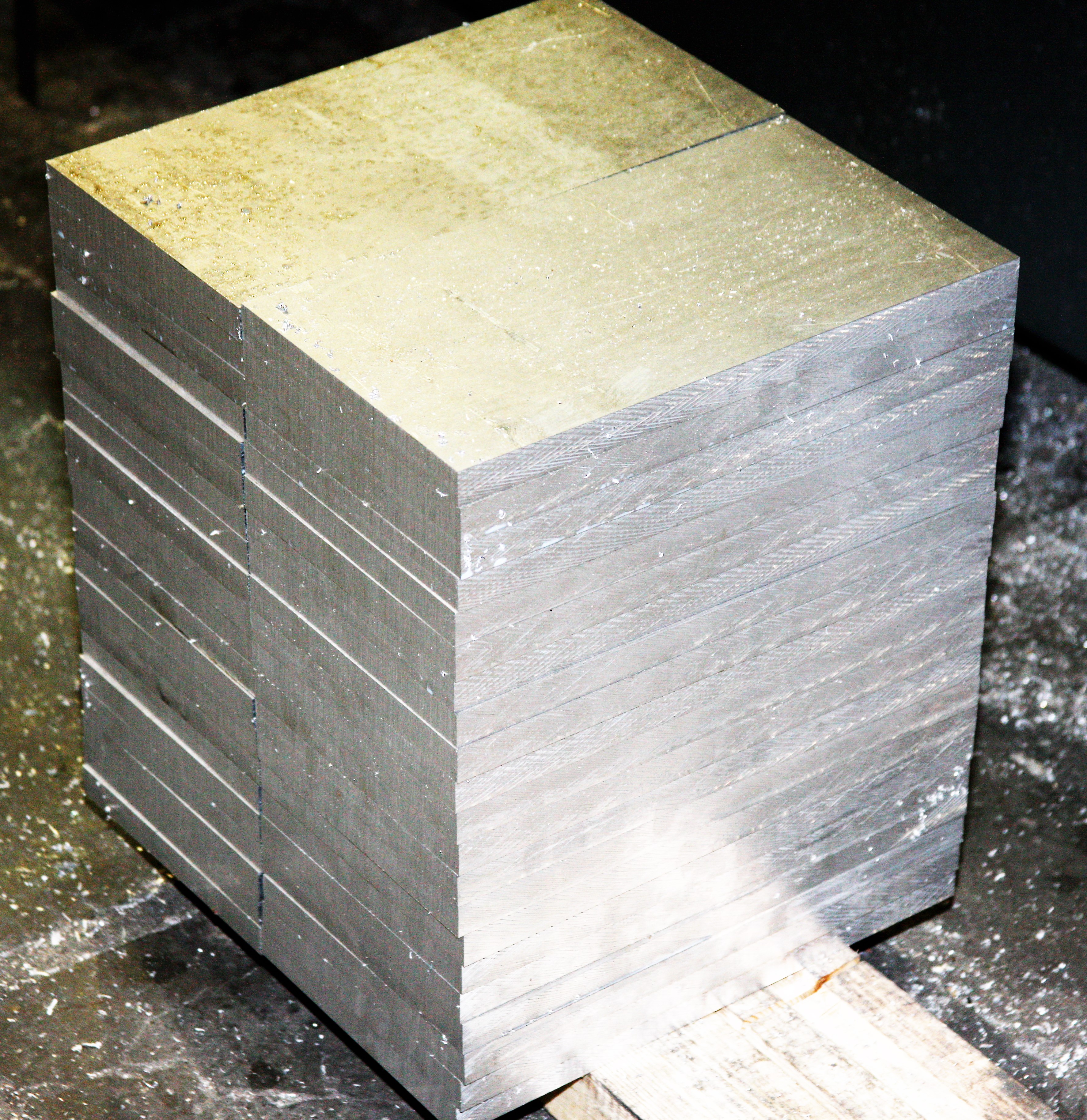 На упаковку из плит АМГ6 =140мм сверху положены обрезки. Горбушки и торцовочные кромки.