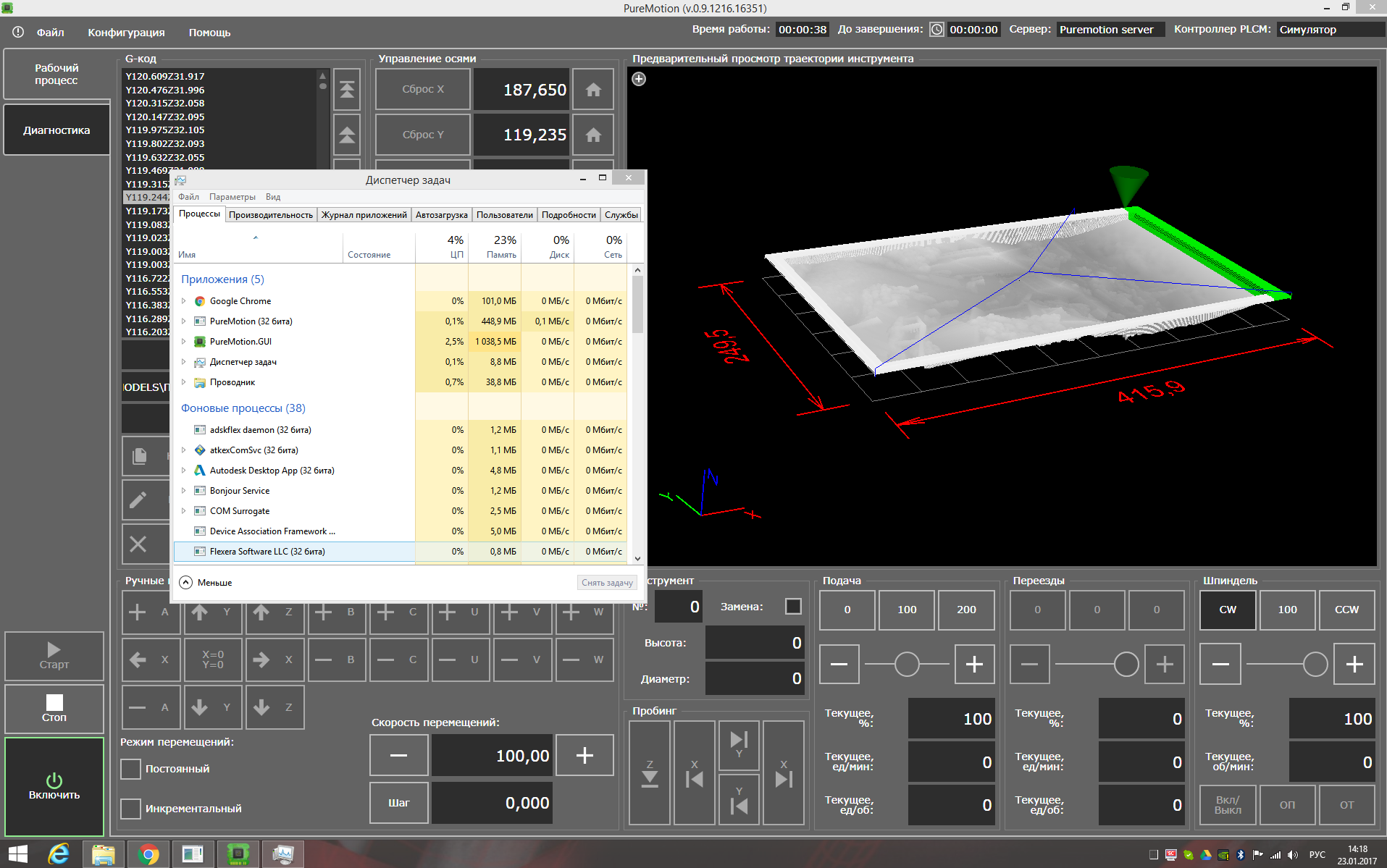 Для WinXP 32 бита максимальный объем памяти, используемой Puremotion, составляет порядка 1,8 Гб. На современном компьютере с 64-битной системой значение этой величины в разы выше. К сожалению, точно пересчитать этот объем в количество строк G-кода не представляется возможным - это зависит от самого G-кода. Мы намеренно не стали ограничивать количество обрабатываемых строк G-кода, поскольку производительность компьютеров, на которых запускается PM, может быть самой разной. Вы можете провести собственное тестирование на вашем компьютере, загружая G-код в Puremotion, и наблюдая за размером выделенной процессу оперативной памятью в диспетчере задач Windows (процессы PureMotion.GUI.exe - графический клиент, PureMotion.exe - серверная часть). При превышении вышеуказанных параметров система либо выдаст окно с критической ошибкой, либо не покажет модель до конца, либо поведет себя некорректно при его обработке, в зависимости от места возникновения ошибки. Чаще всего ошибка нехватки оперативной памяти будет проявляться именно при открытии G-кода.