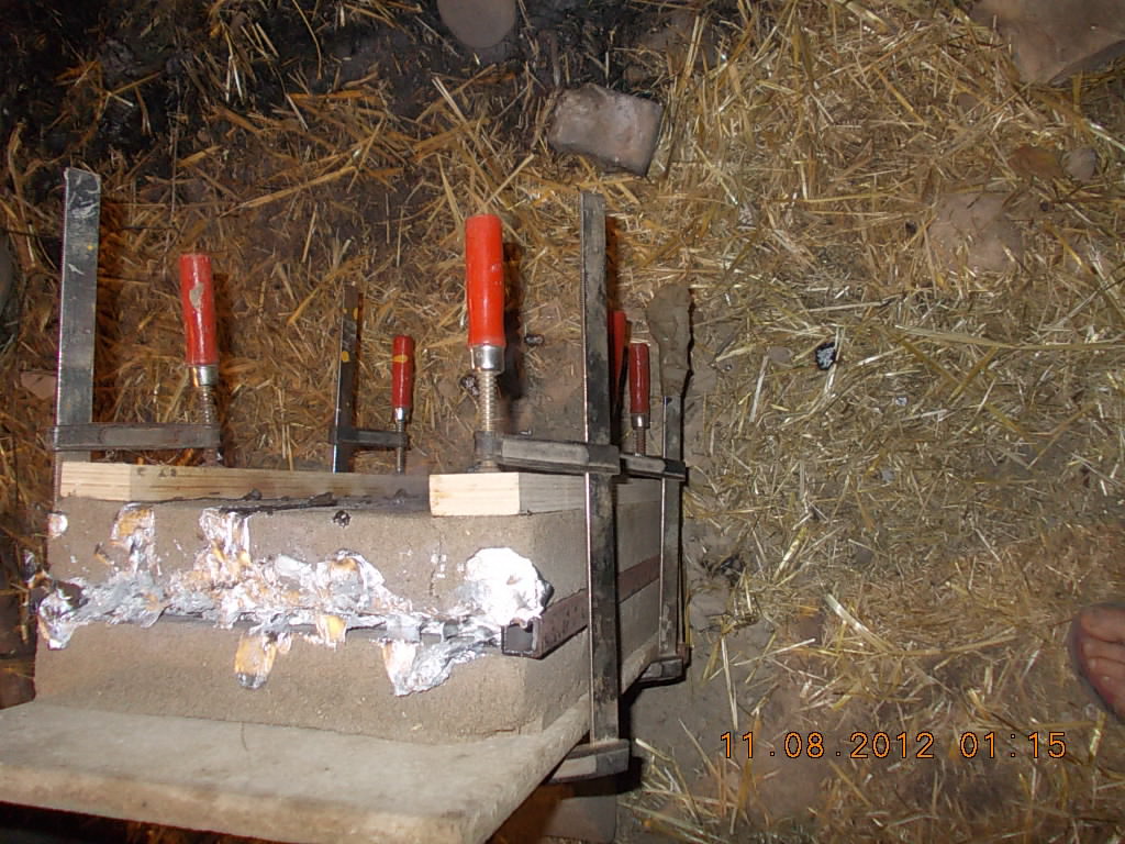"кокиль" из ЖС и песка. Сделали 2 плиты из песка. Ставлю их вертикально, а между ними задаем толщину отливки квадратой тубой и стягиваю струбцинами