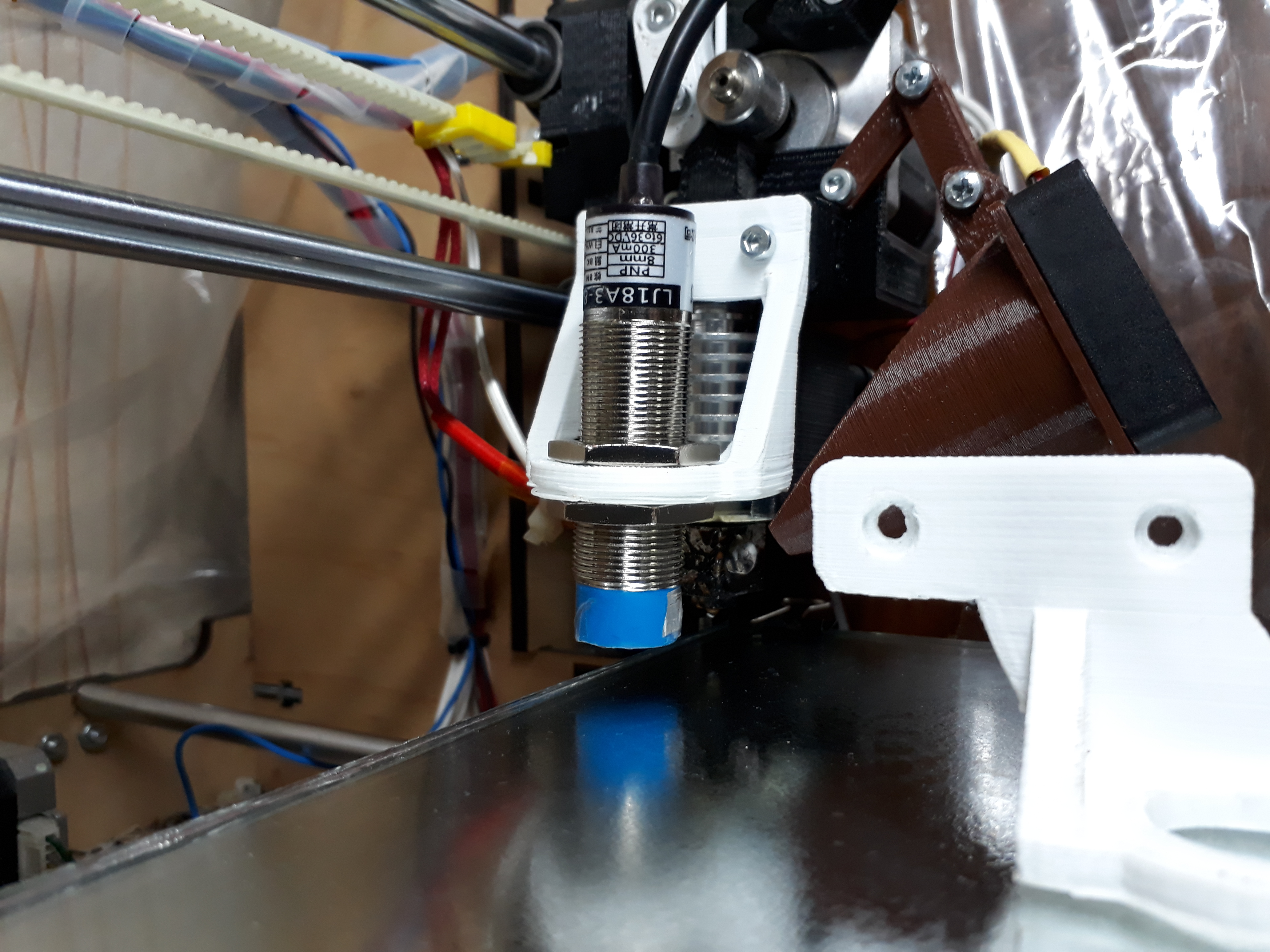 Первый вариант размещения датчика (на фото кронштейн лежит на столе )был смещен на 30 мм от экструдера по х и по у. Такое размещение вместе с ошибкой установки датчика (расскажу ниже) влекло такие ситуации когда экструдер уже касался стекла а датчик еще не сработал. Такая ситуация заставила меня пересмотреть немного схему подключения датчика, родной концевик был включен в цепь, но отрегулирован так что срабатывает уже примерно через 0,5 мм после касания стола экструдером, стол играет на пружинах регулировки и не портится. Тут я понял что выбранный в прошивке уровень срабатывания датчика в 0 с экструдером не верное решение, датчик был опущен ниже на 1.3 мм, и в прошивке внесена коррекция #define Z_PROBE_OFFSET_FROM_EXTRUDER -1.3 . При таком расположении датчик все еще находится выше экструдера 0.3-0.8 мм но в то-же время срабатывает на 1,3 мм раньше чем экструдер коснется стола. После калибровки все сходится четко 0 стола равен нулю по перемещению. После некоторых размышлений сделал новый кронштейн для крепления датчика, тут уже есть только смещение по оси х на 25 мм , что несколько лучше.