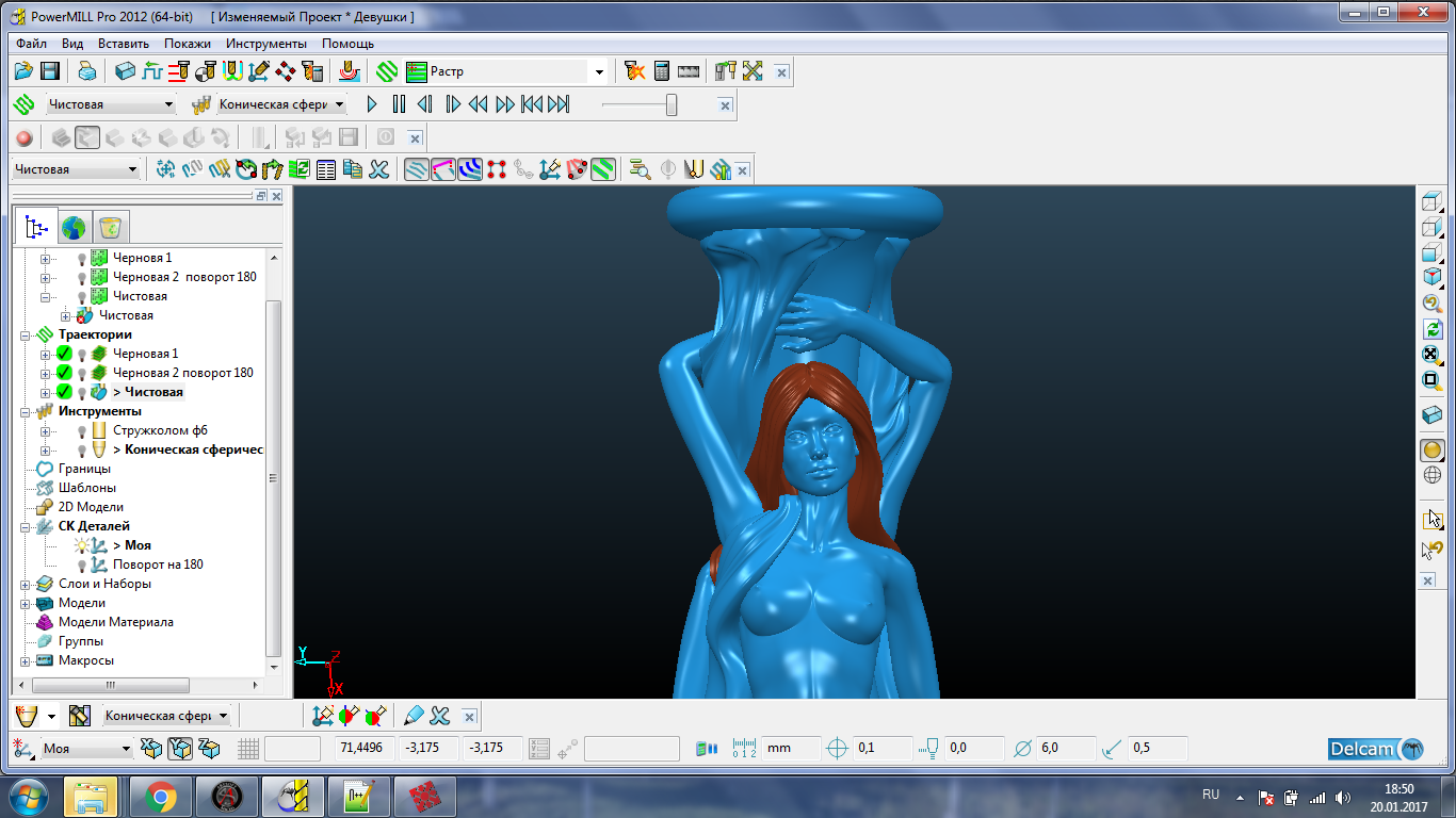 ХЕЛП!!!! Ребята помогайте! Создал траектории моделки балясины с девушками , очень популярная моделька, в повер милл. Сделал черновую с двух сторон , дошло дело до чистовой, дошел до девушек , а она режет не так как надо. А как будто в зеркальном отрожении в отличии от черновой обработки. Че это за хреновина такая??? В повер мил все ровно как и положенно.