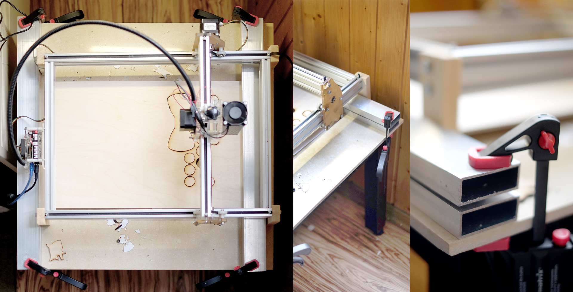 Я зажимала ее четырьмя струбцинами по углам. Но и тут поняла что и этого мало. Купила металлический профиль, нарезала его нужной длины на 4 колбасы и зажимаю фанеру с 2х сторон между 2мя профилями, прижатыми к столу (у меня это плита керамогранита) струбцинами.