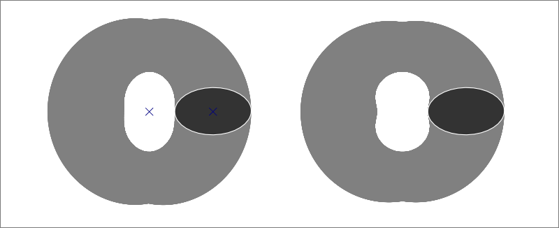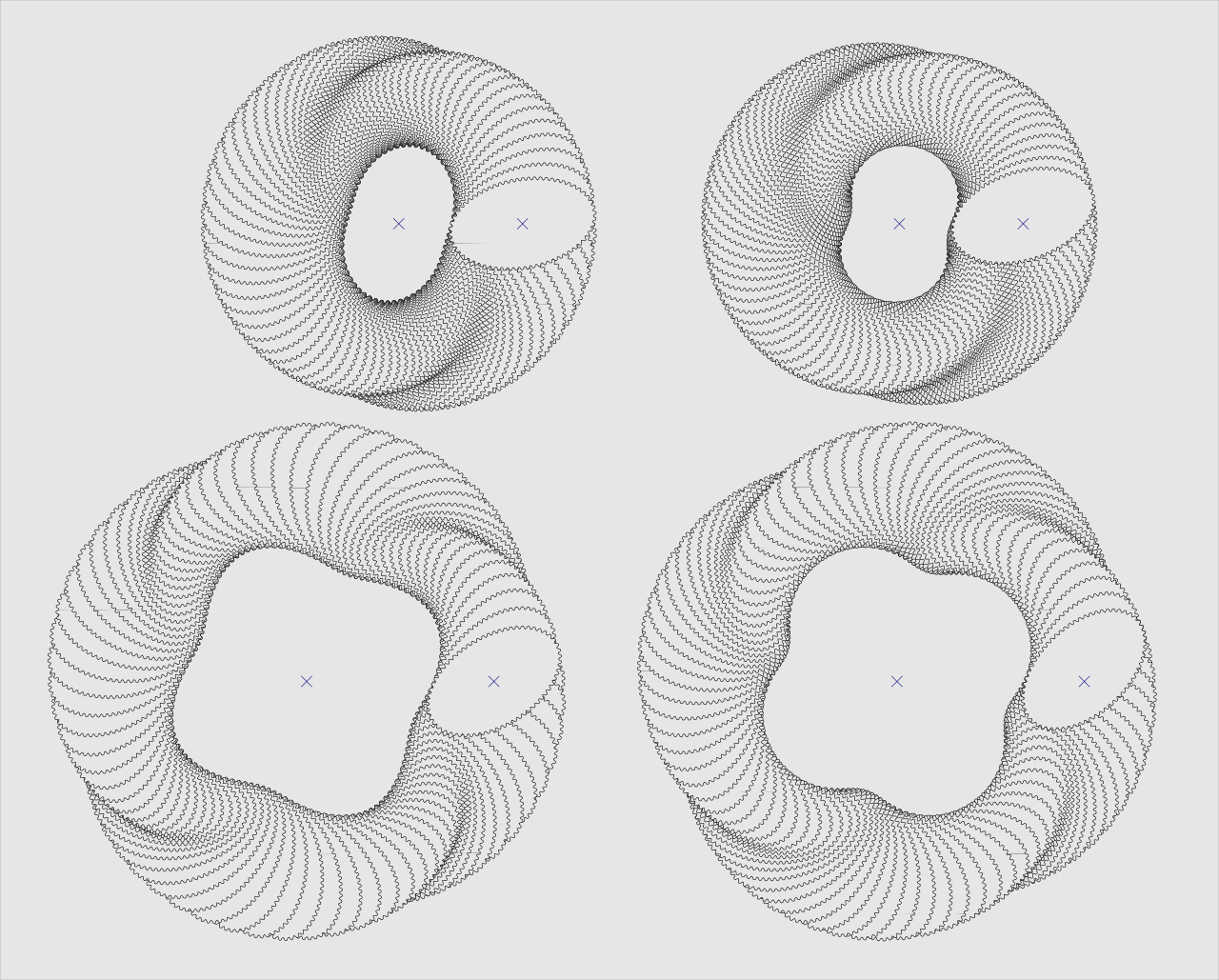 Да, очень похоже, что проблема именно в этом. И это очень здорово. Попробовал не менять размеры - просто от руки сделать эллипс похожих на правду размеров - и реально очень неплохо выходит, хотя и чуток фасолево по непонятной причине. Попробовал взять квадрат, и на нем вытянуть "зубцы" разного размера и формы штуки по три-четыре на сторону - и да, невероятно мощно улучшается результат. Оно, собственно, начинает всерьез зацепляться, в отличие от предыдущего, и более того - шестеренки начинают становиться очень похожими по форме зубцов друг на друга (раньше ведомая была вся из характерных "круглых вмятин"). K в районе "разумно выглядящих" расстояний и зацеплений для таких зубастых квадратов получается где-то 0.75-0.85.