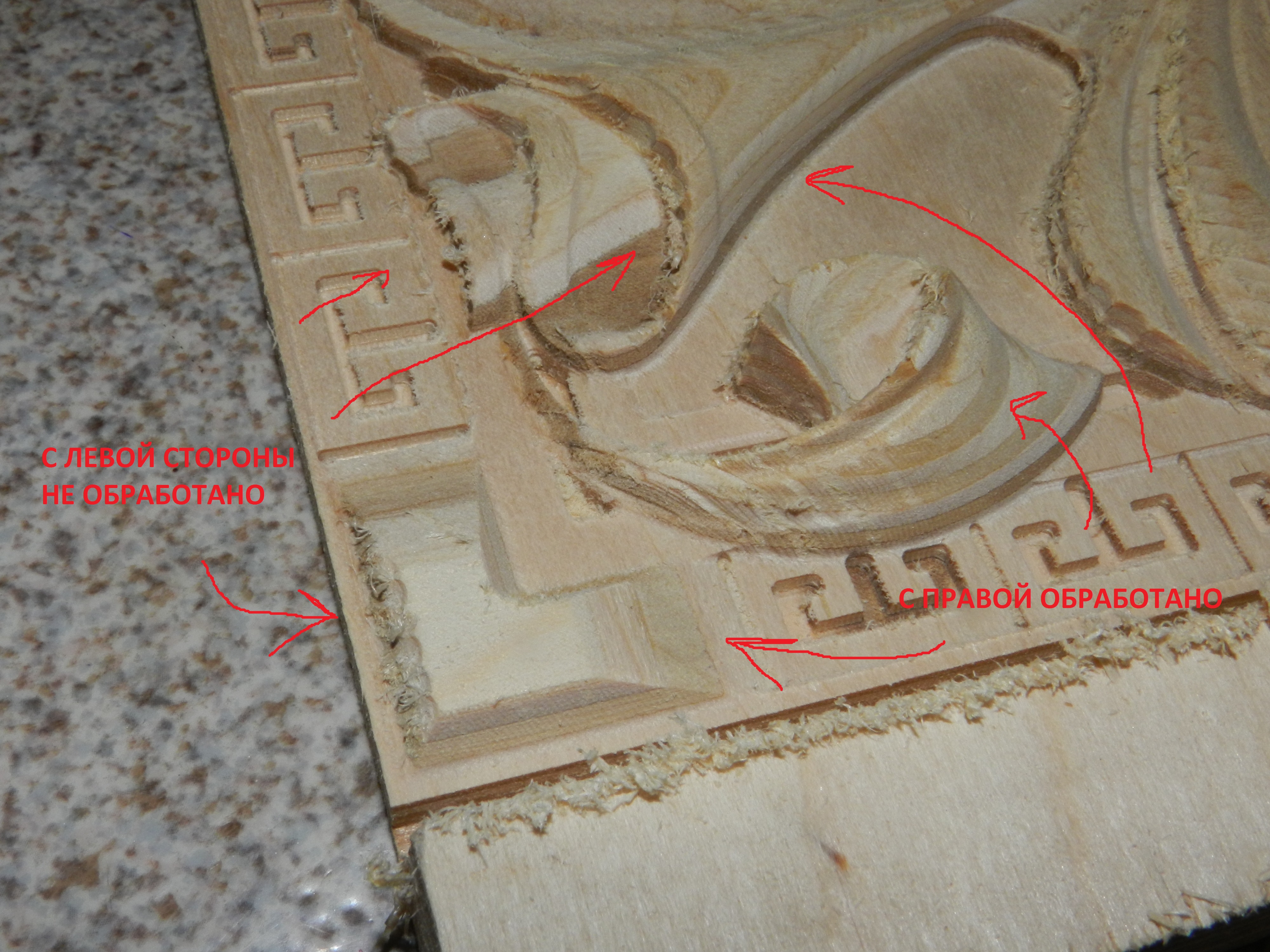 Нажал старт. Пошла чистовая траектория. И тут я заметил что фреза зарезает всю картину с правой стороны и не дорезает с левой. Примерно на 1-2мм.(на фото будет видно). То есть пошло смещение по х в левую сторону. Очевидно. Решил доделать картину. Сделал примерно пол картины. Нажал feed hold, выключил питание станка, но оставил компьютер включенным, с запущенным матчем (чтобы вдруг не сбились координаты, на которых остановился).