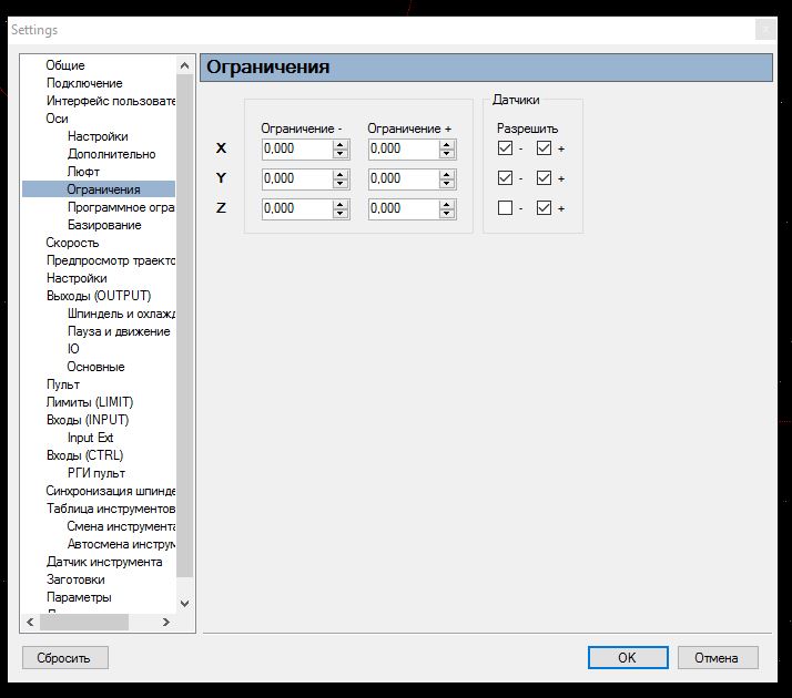 Судя по настройкам, у тебя 8 входов для концевиков осей XYZA, по 2 на каждую ось, на первом скрине не видно ось A из-за настройки выбранного вида станка.