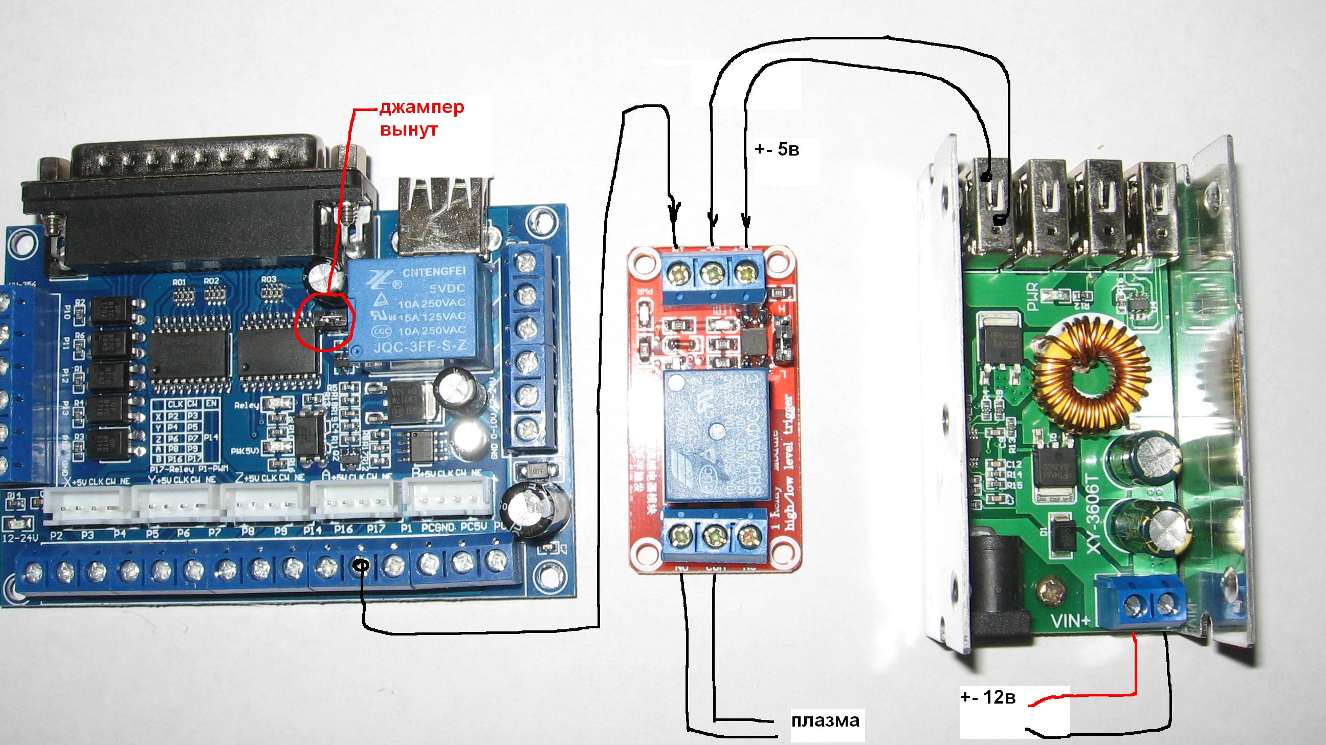 Проверил между PCGND на контроллере и V- на блоке питания для доп реле. Звонятся сволочи. Убрал с контроллера 12 вольт , всё равно звонятся :thinking: Подскажите по простому какие проводочки куда воткнуть чтоб не звонилось и помеха не проходила а то в схемах не понимаю я ничерта... Динозавр я :cry: На вашем фото не могу разобрать на перемычку на какой контакт проводочек впаян? После моего подсоединения при работе плазмы ось Х хреново отрабатывает и ось У погуливает. Когда с кнопки вручную включал плазму, такого не наблюдалось.