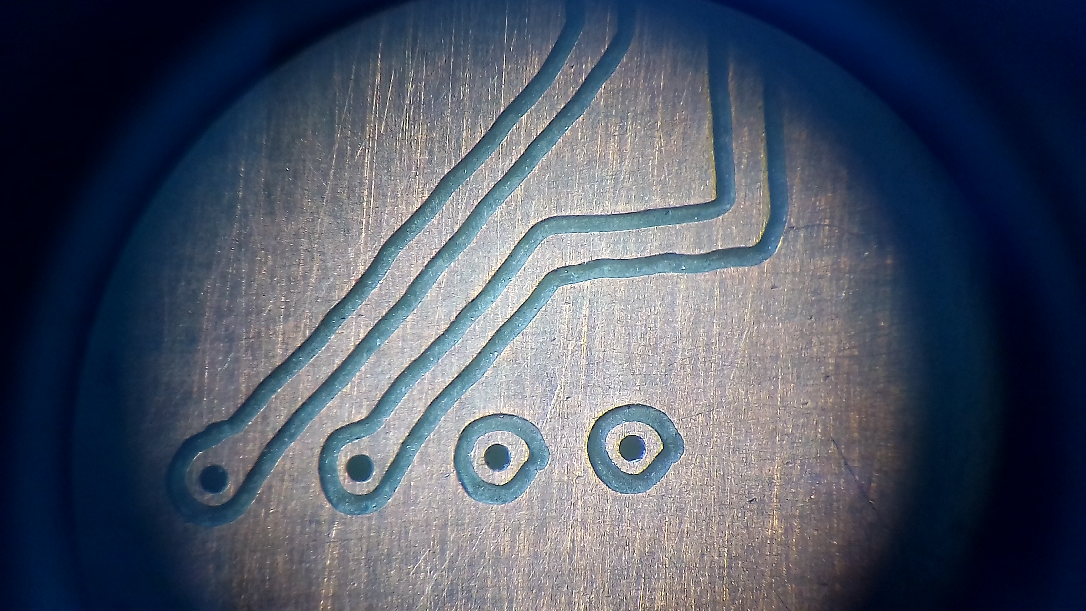 чинайский штихель 0,1мм 10 градусов, подача 180мм (много?), глубина 0,06, работа в один заход без карты высот. (первая проба - перешёл с CopperCam на FlatCam.. задоблали глюки копера, когда при импорте сверловка, фрезеровка и контур - в трёх разных углах листа.. а так-же генерит команды, которые Candle 1.17 не понимает и сообщает об ошибке (М07, М08). Так-же "флэт" порадовал тем, по завершению работы фреза всегда возвращается в исходное состояние. А бесплатность и возможность автоматизации через скрипты.