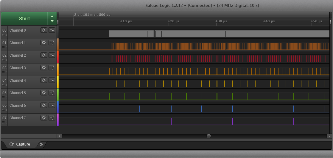 А я тут как раз с результатами быстродействия пришёл. Тестовая программка на С. Пробую скорость пакетной записи в порт с помощью процессора. Использую первые 8 пинов порта А. Пины подтянуты к 3.3V встроенными резисторами 50 КОм. Для теста использую однобайтовый массив со значениями пинов (битов). Массив создаю так, чтоб частота вывода следующего пина была в 2 раза ниже чем у предыдущего: