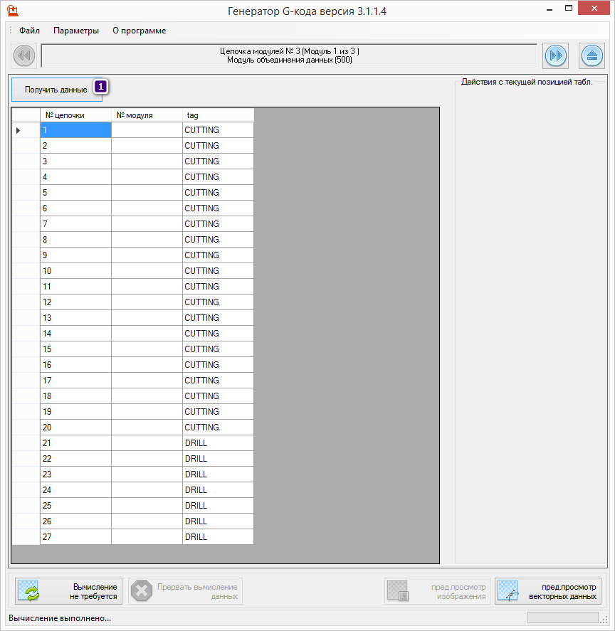 Далее переключается на следующий модуль: В котором нажимаем кнопку, и получаем траектории для фрезеровки, и сверловки.