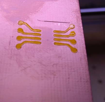 Собственно временное крепление + сам нож: На текстолит наклеил термо-пленку, и прошелся по контуру проводников радио-схемы: После удаления, пленки: Т.к. это первый пробный раз, то за качеством не гнался, но реально можно получить и лучше результат