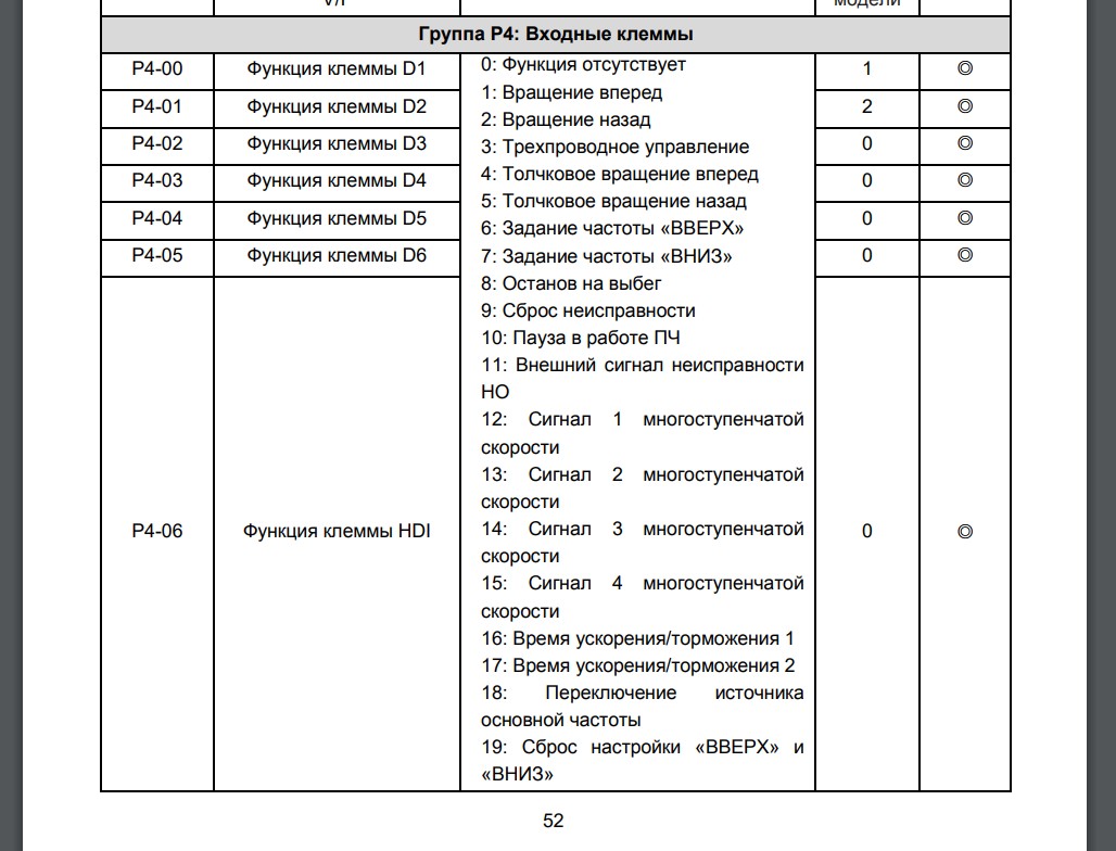 Таким образом, в нашем случае (для клеммы D3) нужно в параметре Р4-38 установить 00100 (единица в разряде сотен означает срабатывание при низком уровне сигнала для D3, т.е. при его пропаже, что нам и требовалось).