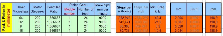 Вопрос к знатокам как посчитать эту злосчастную частоту. NCStudio до 47кгц. Рейка М1,Редуктор 1,67, шестерня 24, шаг 1/32 шаговик 47кг драйвер AM882.В мач на данный момент выставлено скорость 9 метров ускорение 150мм/с . Под Мач есть калькулятор в Excel вот какую частоту он показывает. Суть вопроса в том достаточно ли NCStudio до 47кгц за 40$ под мои хотелки. Покупать на 120кгц за 200$ побороть жабу :lol: