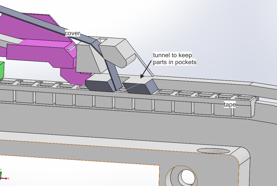 Питатели - самое сложное пожалуй. Я проработал схемку с перемещением ленты протяжкой на шаг за отверстие, основываясь на одном из предложенных вариантов на сайте openpnp (от alexavr2 ). До этого пытался автоматизировать на сервомашинках, поджим на электромагнитах... Хорошо, но дорого и долго собирать.