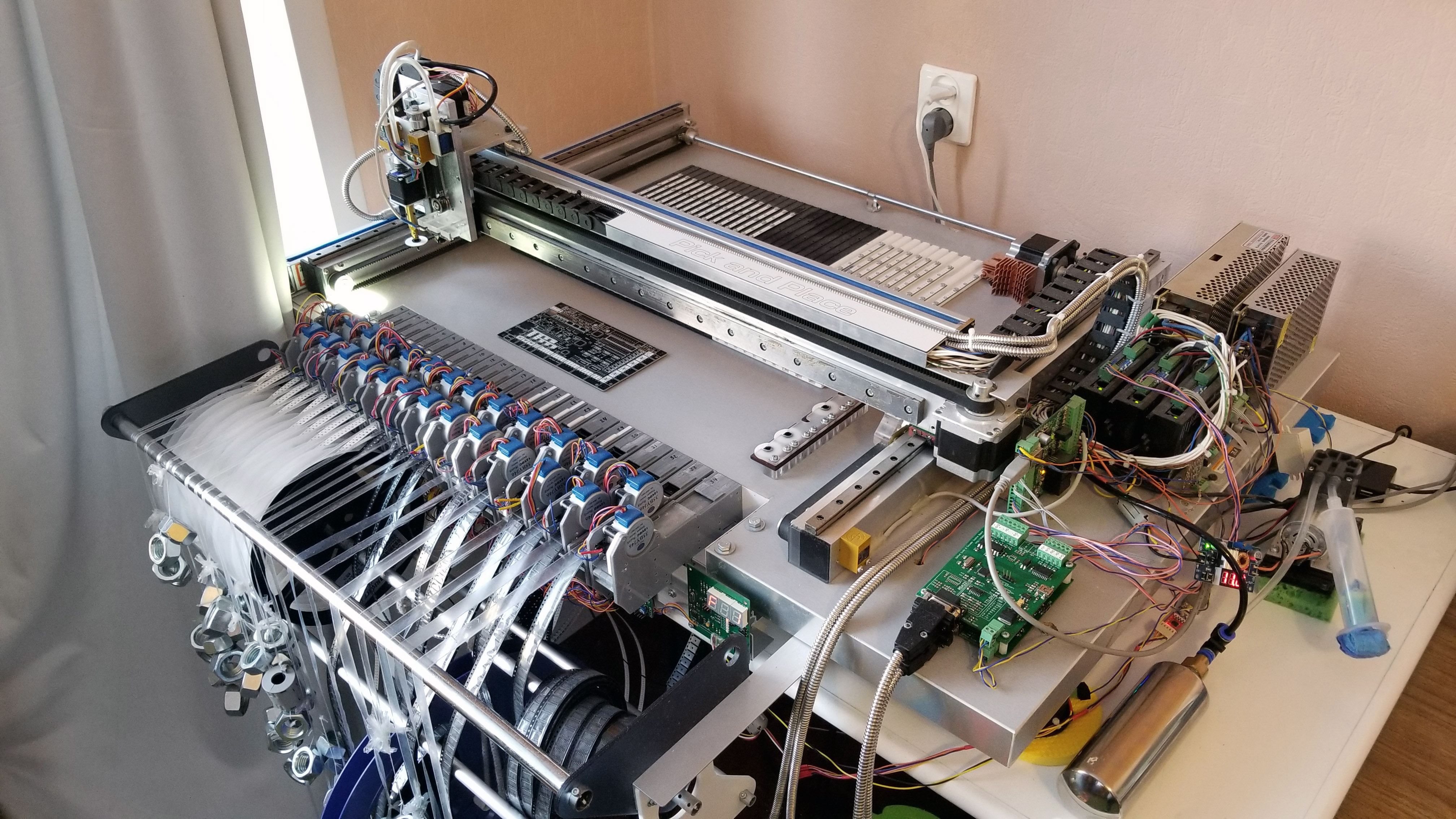 В целом - хорошо. Ест проблемы с тем, что сопло можно ударить и погнуть. Камере можно случайно башку свернуть... Из за этого приходится перенастраивать. Геометрия хворает (оси камер немного не вертикальны). Бывают с питателями проблемы (например, лента может остановиться дальше, чем остановился мотор с зубчатым колесом из за люфта зубов в отверстии). Бывают проблемы с работой фотодатчиков в питателях (намудрил с прошивкой питателей, ради того, чтобы реализовать шаг 2 мм, что снизило надежность в нештатных ситуациях).npa писал(а):Как у автора с точностью и повторяемостью?