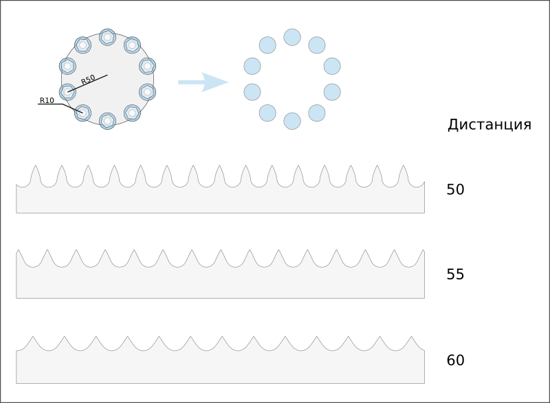 Кстати вот такие рейки получаются, при 10-ти подшипниках с разными расстояниями до центра: