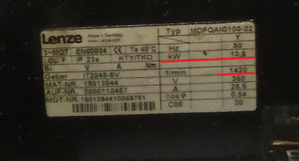 Двиг Лензе 10.6квт на 1450об/мин, округли до 11квт ;) Шпиндель на 8000 об/мин, двиг 1500 об/мин разгоняются частотником до 5000 об/мин (дальше ограничение в настройках). Если у тебя двиг стоит на 3000 об/мин то он будет меньше момента выдавать, вот потому мож и воткнули у тебя двиг на больше мощь и разгоняет шпиндель до 10 000-12000 об/мин, а у нас до 5000 об/мин.