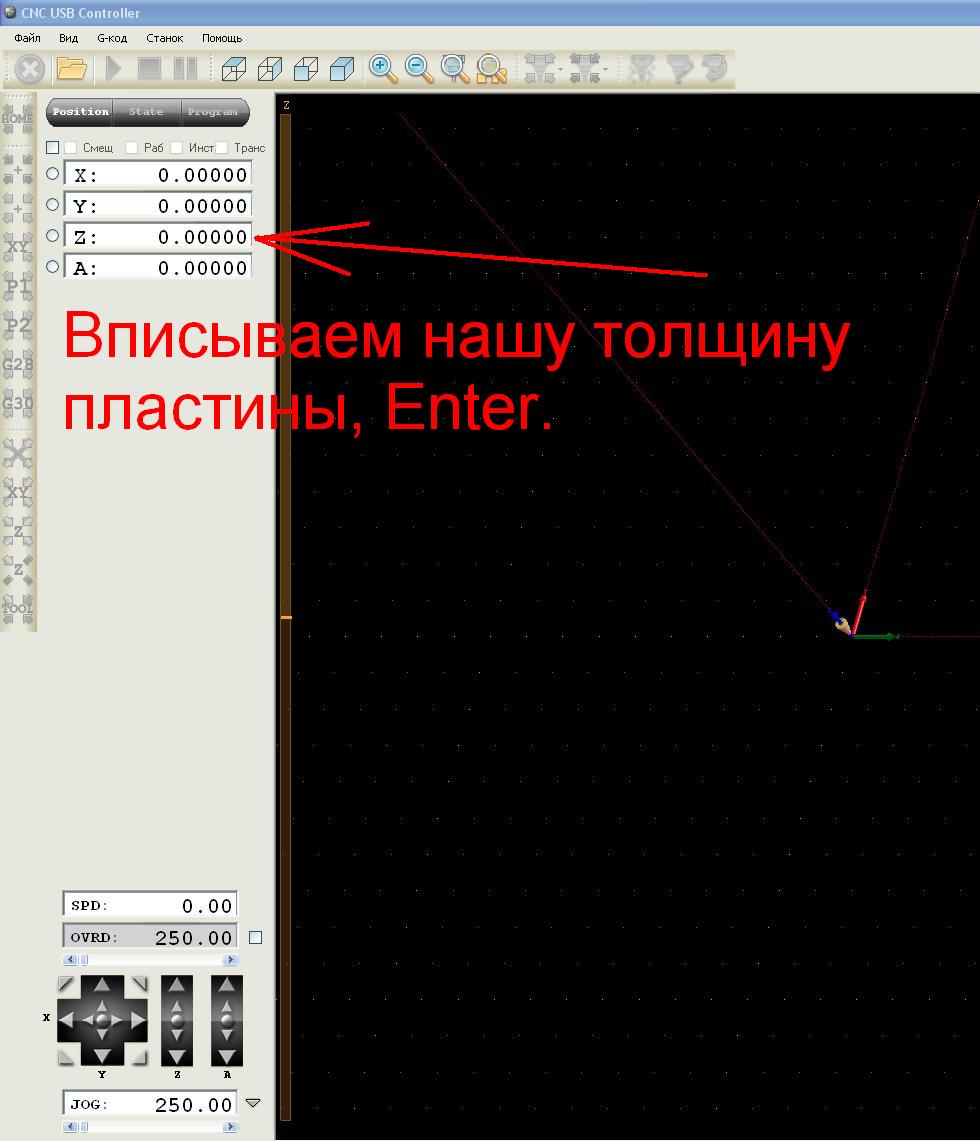 Вписываем нашу толщину пластины в окошке Z координат, Enter. Все на делали будет ноль. Конечно в менюшках можно сразу заложить толщину датчика и прога сама отнимет толщину. Но так как я пользуюсь разными датчиками (текстолит 1.5мм, брусок 20мм, тул-сенсор) мне удобнее забить ручками толщину Z после измерения.