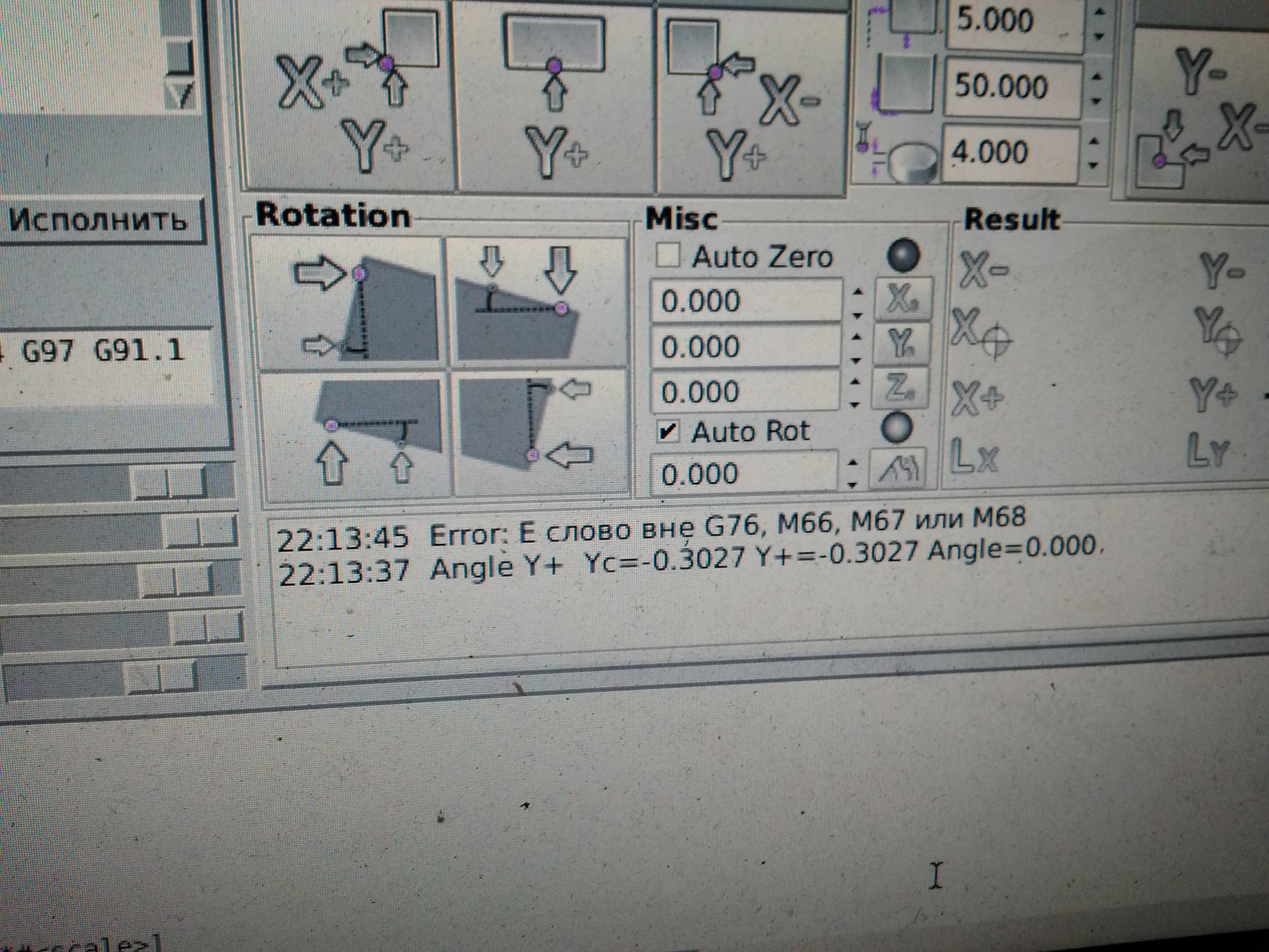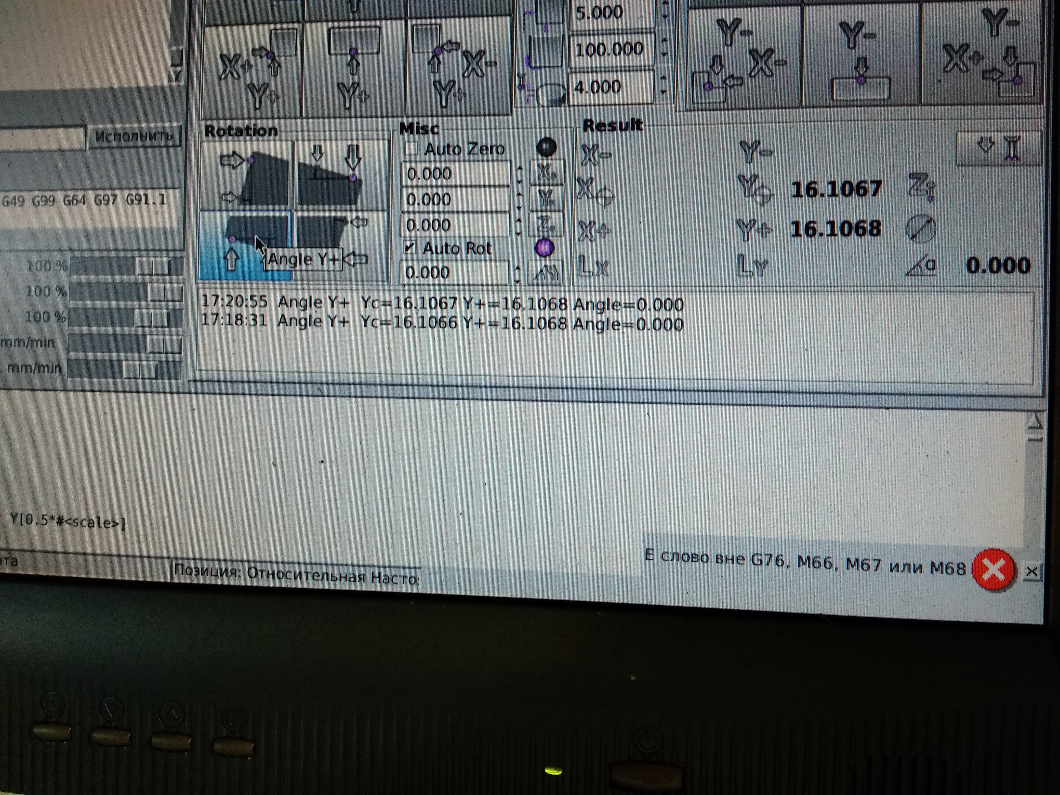 1) E слово вне G76, M66, M67 или М68. Появляется сие как видно из картинки при попытке найти угол смещения координат. Как было: задаю скорость поиска 100 мм, оно тыкается щупом в звготовку, едет на 100 мм, тыкается снова, поднимается и едет назад, по середине пути тормозит и выдает эту ошибку углы по нулям (хотя это не так). Потом я уменьшаю дальность поиска до 50 мм. Едет, измеряет , возвращается - все в порядке, показывает угол. при следующем измерении едет опять на 50, но происходит снова эта ошибка. Уменьшаю длинну поиска до 10 - все срабатывает один раз, в следующий раз та же ошибка. Перезагрузили пару раз комп - перестало. Кстати потом при попытке на вкладке "Probe screen" поменять в окошечке дальности перемещений поменять эти 10 мм, но оно становится пустым и ничего нельзя ввести, курсор не мигает - перезагрузка, все нормально.