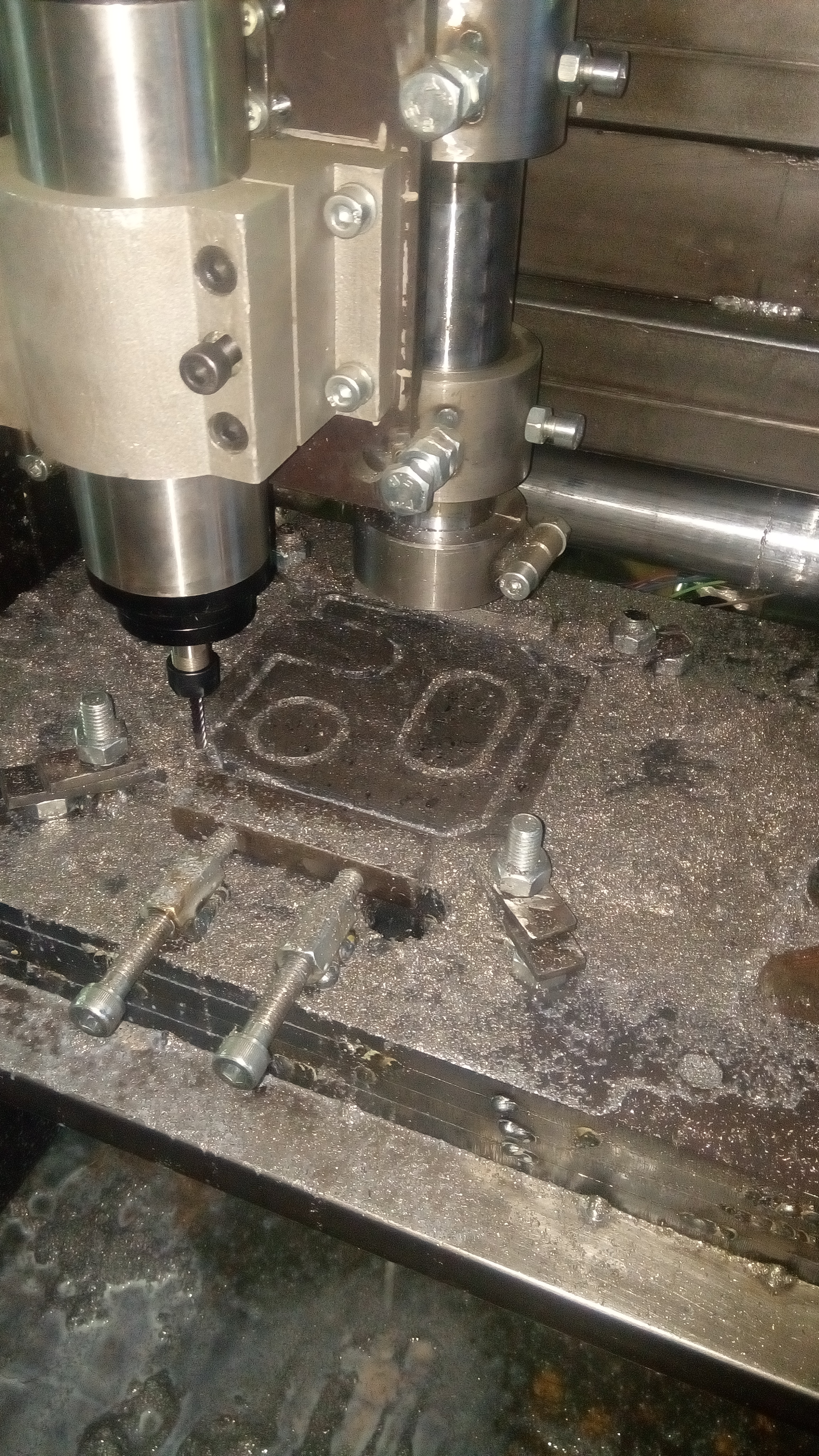 Фрезер хорошо выручает. Сегодня сталь 45 толщина 8мм, перемычки решил не делать, а оставил небольшую фольгу снизу детали. Фреза та же длинная другой пока нет. Время выполнения 1 час 6 мин. Деталь вписалась во фрезерованное место на столе 150х150 почти впритык. Стол кстати после езды индикатором показал скачки в 3-4 сотки и только в местах где фреза на фрезу след делает. Немного фоток: