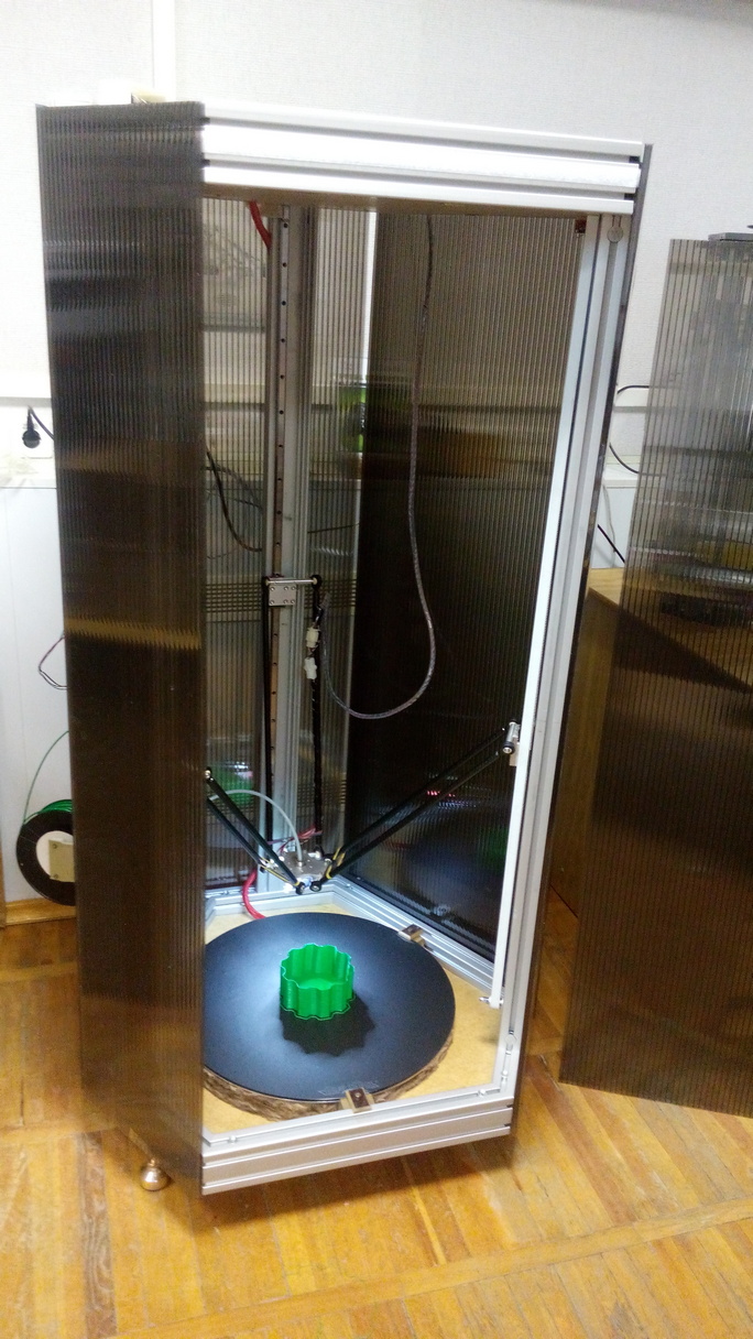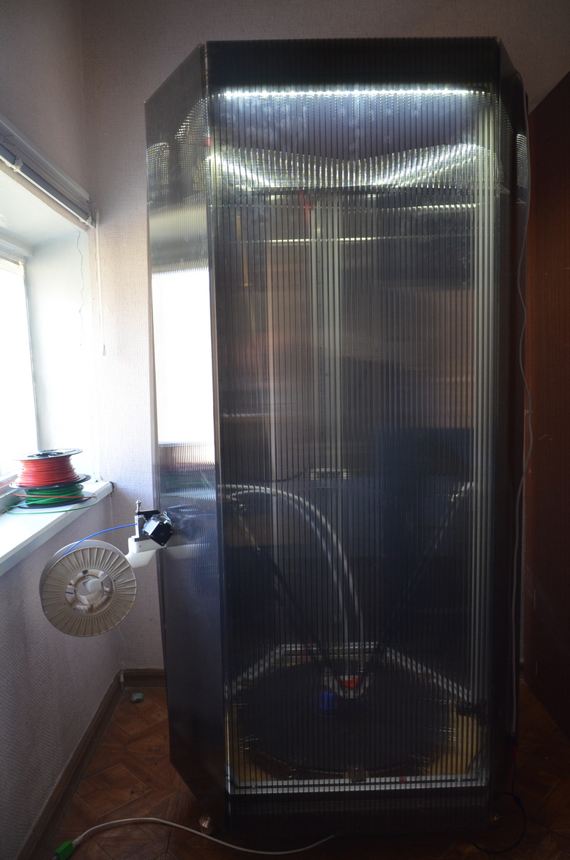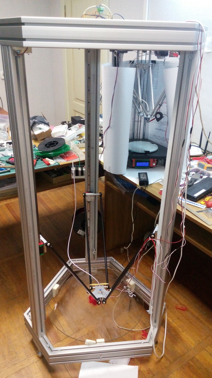 Большой 3D принтер "линейный дельта" (высота около 1800мм). Спроектирован и изготовлен в 2016 году.