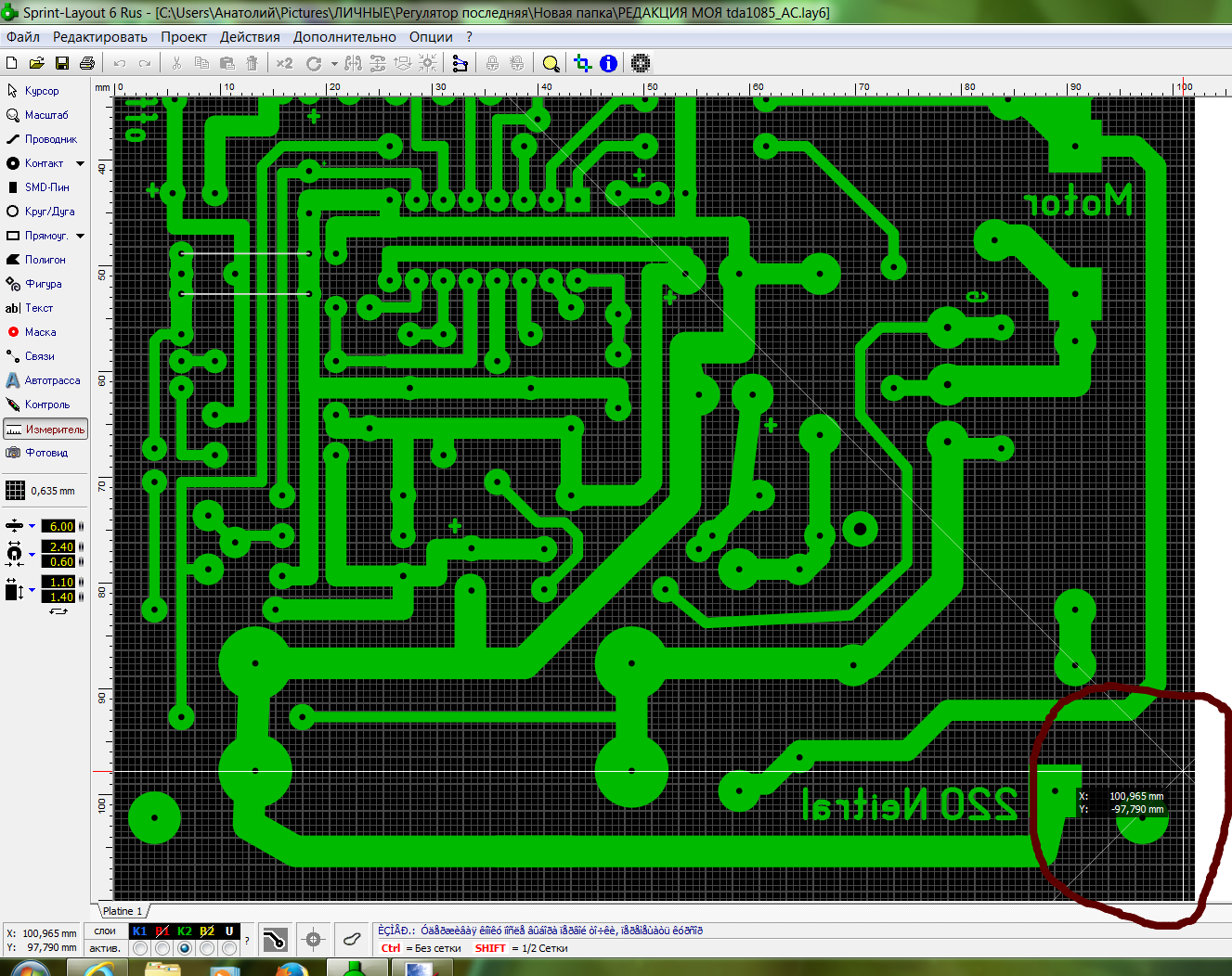 Во , теперь увидел . Спасибо . Действительно так . Поменял , всё встало как надо . Но я всё равно пошёл немного другим путём . Поскольку результат всё равно плохой , это по тому что наверно СпринтЛоут ломанный ( скачал 7 версию уже , КСТАТИ в 7 увеличено поле до 300*300 ) . Так вот , я в СпринтЛоуте правлю плату и конвертирую в BMP формат , потом открываю в Пайннете и обращаю цвета , открываю в Арткаме , в векторной вкладке обращаю растр в вектор , с созданием наружного контура , выделяю всё и в 2D обработке по профилю создаю УП . Гораздо лучше получается . Правда не весь лишний метал убирается - главное прорезать , а там Лут в помощь ( можно перманентным маркером закрасить наконец нужное ) . Надо додумать как лишнюю медь фрезой убрать . Конечный вариант УП ...maxx2000orel писал(а):А вы гляньте на линейку слева на скрине Лайаута. Там же видно что у Вас как ноль взят Верхний левый угол. Вот и получается, что Х у Вас положительный. а У отрицательный. Найдите на экране маркер начальной точки и перетащите куда Вам удобно. .Mark 24.ru писал(а):Сделал скрин ,