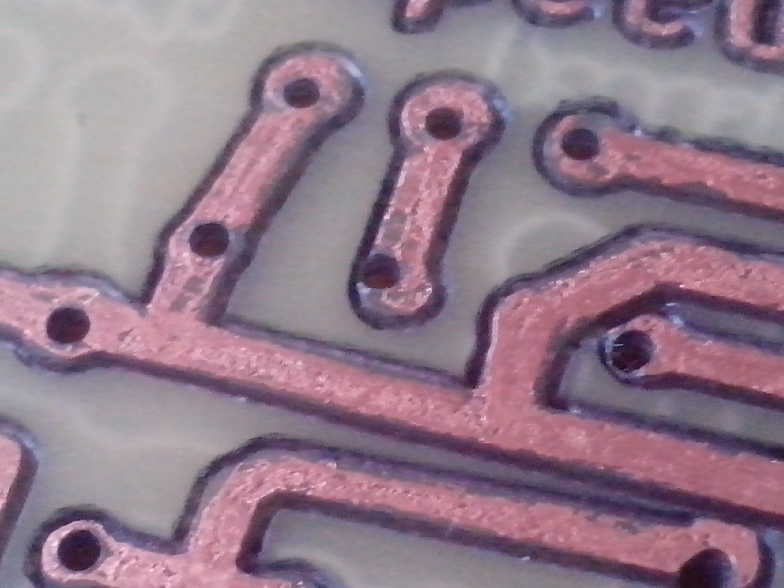 Не надо так - доведите или один способ или другой до качественного результата если это, конечно, не последняя плата, которую собрались делать (если бы мне все равно пришлось совать плату в жидкость - я бы на станке только сверлил, необходимость что то куда то наливать/травить, промывать и т.д. почти лишает смысла фрезерование т.к. полностью ЛУТом должно получаться лишь немного хуже, а вся прелесть фрезерования - воткнул заготовку, пошумел, готово). Если нужна плата на которой только немного дорожек и нет меди - лучше и быстрее ЛУТ, но часто лишняя медь совсем не мешает и достаточно дорожки по контуру прорезать в несколько проходов с увеличивающимся отступом (sprintlayout - экспорт в .plt, задать N проходов со смещением 25-50% - stepcam).Mark 24.ru писал(а):Правда не весь лишний метал убирается - главное прорезать , а там Лут в помощь ( можно перманентным маркером закрасить наконец нужное ).