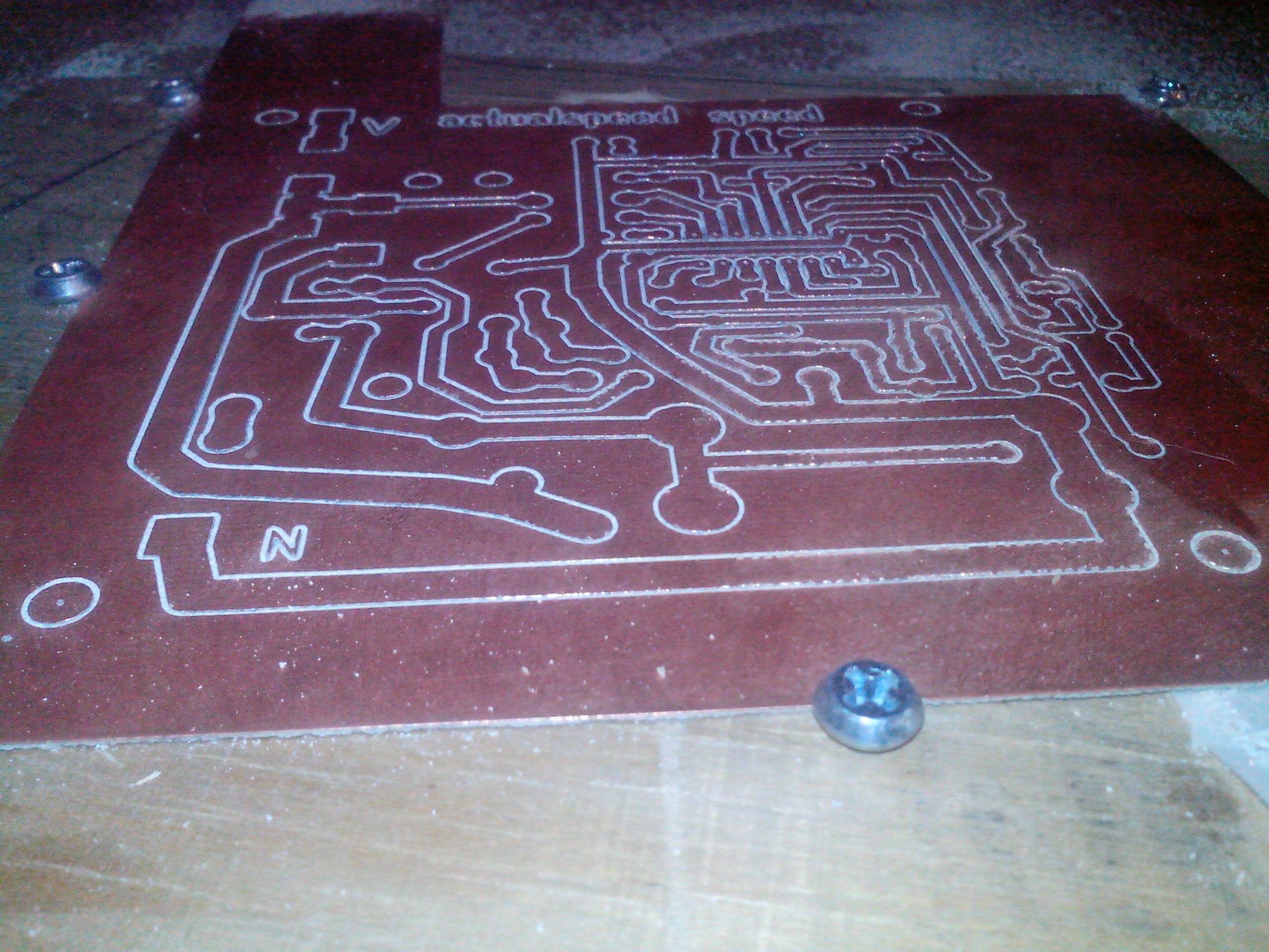 Попытка номер 2 . Здесь я решил просто фрезеровать , после лишнее удалял канцеляриком помаленьку . Без всякого ЛУТа . Заглубление правда всё равно как следует не выставил - сломил кончик фрезы , надо отдельную плашку для плат завести , на скотч наверное , а то крепление по краям саморезами несколько выгибает платку .