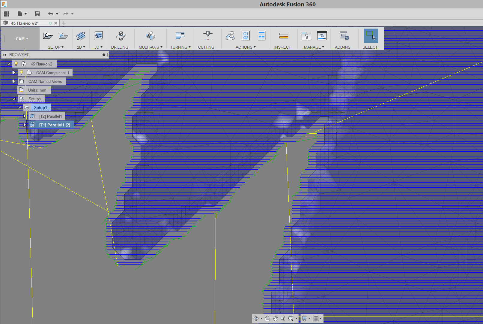 Размер, грубо говоря, 95 х 75 мм. Попробовал радиусной фрезой 0.1мм с шагом 0.01мм. Расчёт занял около 5-ти минут. Расчёт успешно завершился и модель вместе с мульёном линий реза фрезы нормально вертится-крутится в редакторе. Надо отдать должное прогерам из команды Ф360, оптимизация отображения на высоте.