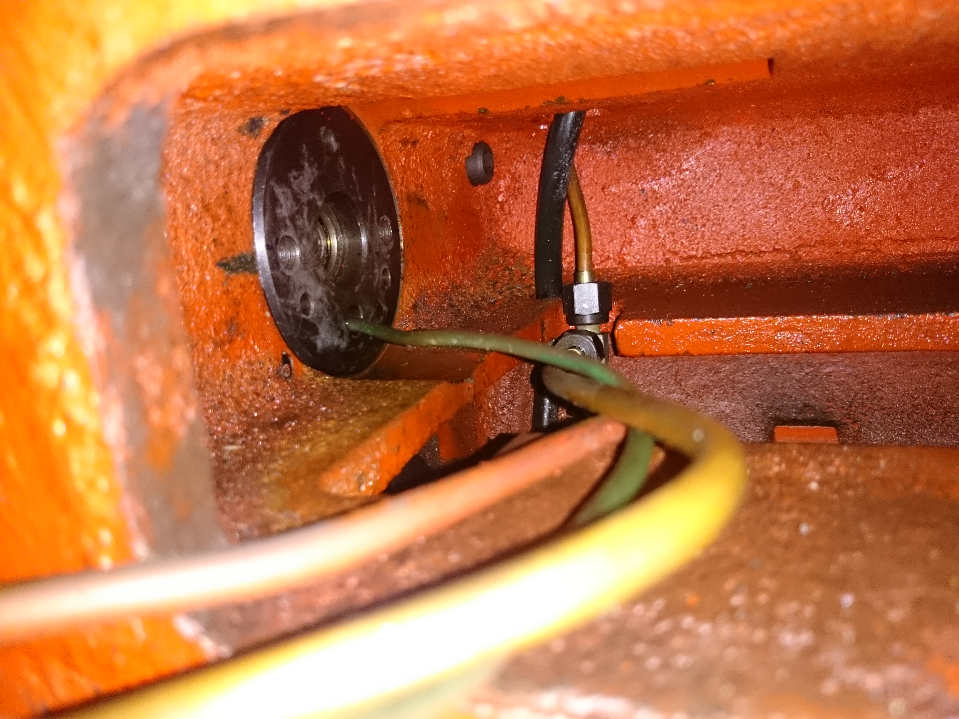 Непонятно предназначение вот этого узла рядом с коробкой, правее и выше стоит. на валу мотора червяк, червячное колесо на валу привода шпинделя, посадка через фрикционную муфту. с обратной стороны муфты два провода. Это электромагнит для блокировки фрикциона? Этот узел вообще для чего? доворачивать шпиндель в положение смены инструмента?