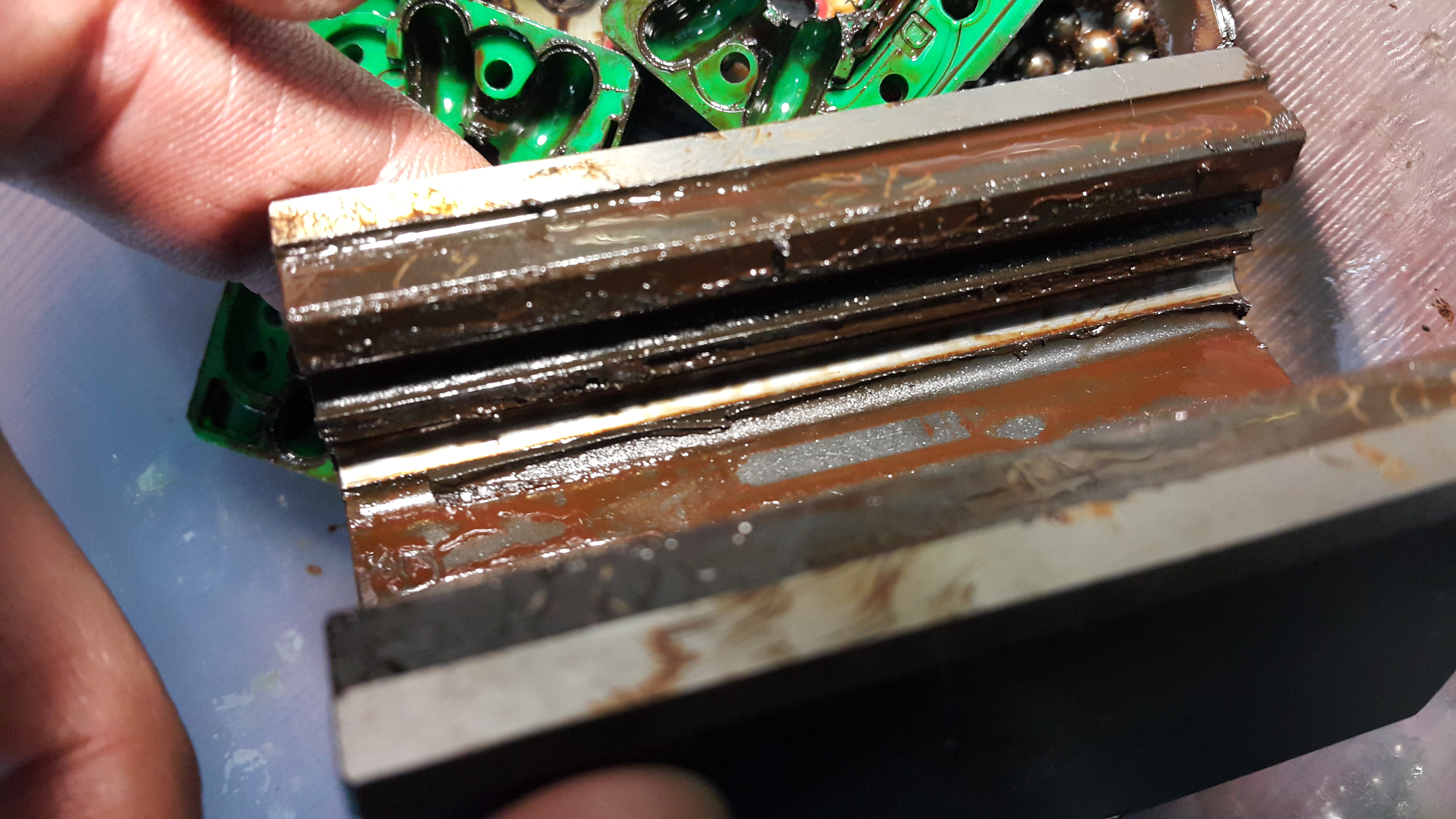 После мойки каретки конечно перестали греметь, но люфты то тоже никуда не ушли. 2 каретки на неизношенных частях рельс имеют преднатяг, плотненько так, 2 же катаются легко и свободно.