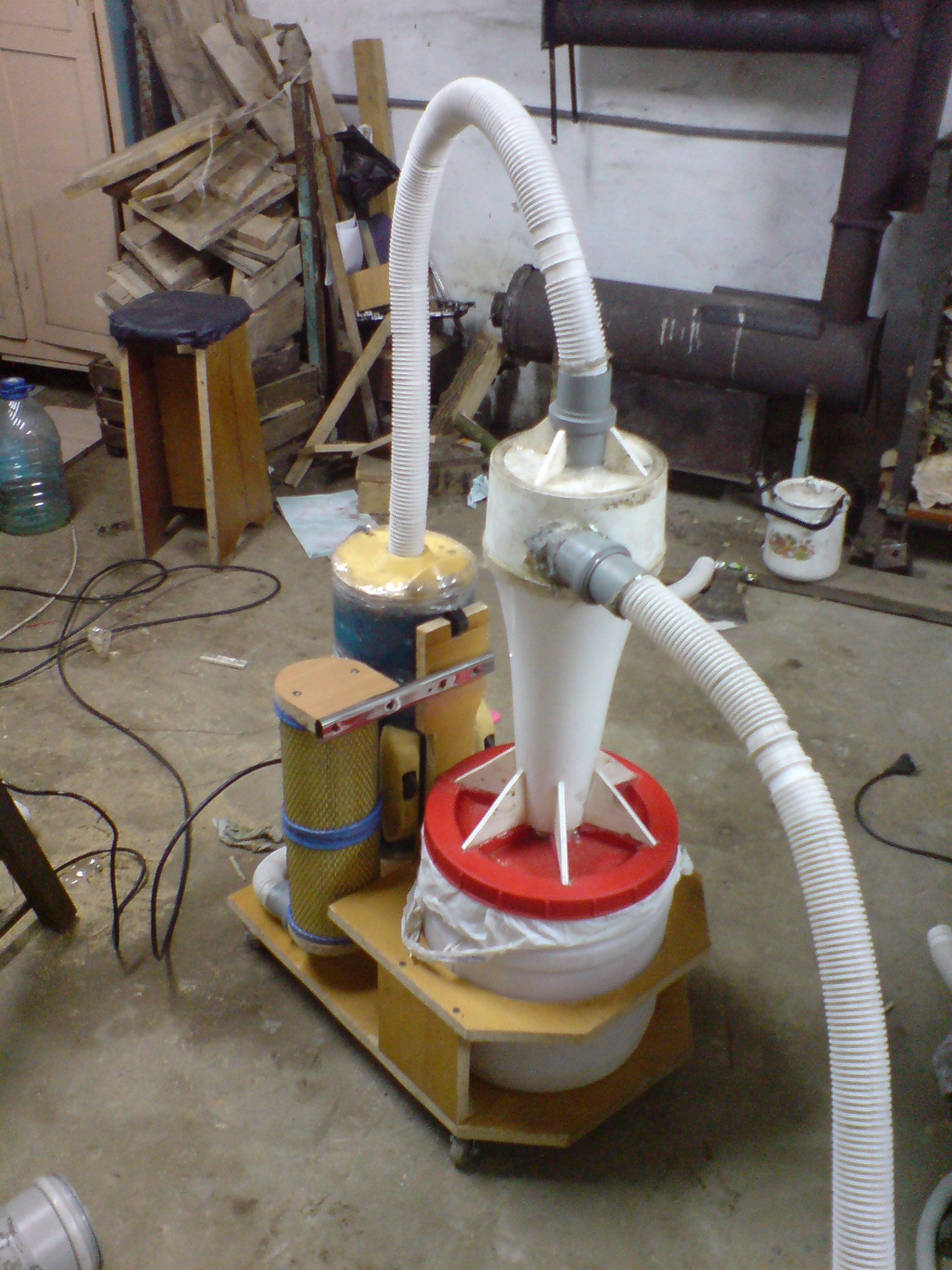 Вы тут сильно все усложняете, я решил просто и практично. Циклон склеил из ведра из-под краски и подставки под цветы, потом пылесос какой был, потом два воздушных фильтра от москвича. После циклона в пылесосе ничего нет, но даже если хоть что то и проскочит то останется в фоздушных фильтрах. Данное устройство работало 6 часов без остановки без проблем. Пилил даже текстолит, отлично пыль задерживало. Бачок забивался полностью и ниразу ничего не бабахнуло. И еще им классно в мастерской пол убирать, тянет все подряд кусочки деревяшек даже винтики и гаечки