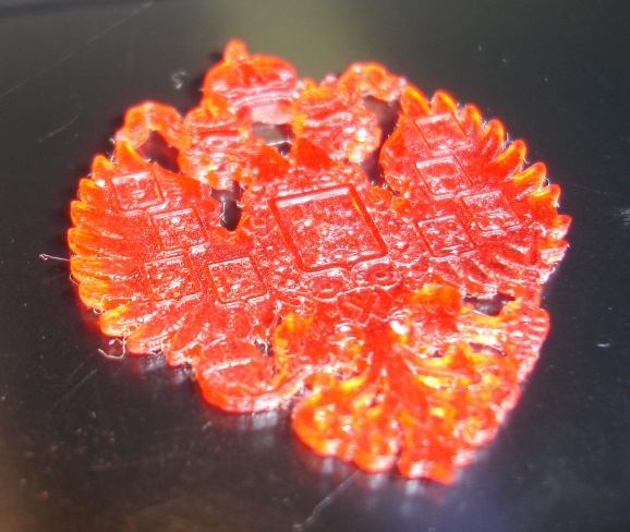 Обратите внимание на герб с короной и саблей. Отверстия в короне пропечатались. Я бы сказал, что результат лучше, чем на DLP-принтере с разрешением 50 микрон, по крайней мере с обычными (не ювелирными) полимерами. Это связано с присутствием в спектре DLP длин волн 410 нм и выше, которые дают сильную паразитную засветку.