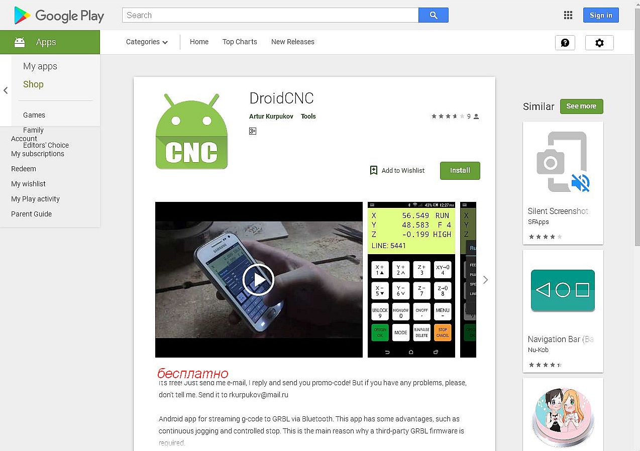 Но вопрос не в этом. Я весьма хреновый програмист, для меня гораздо проще сделать механику, чем разбираться с прошивками. Начал искать подходящую прогу для своих нужд. Нашел GRBL Droid, еще несколько, и DroidCNC. По мнениям участников этого форума програмка простая и хорошая.