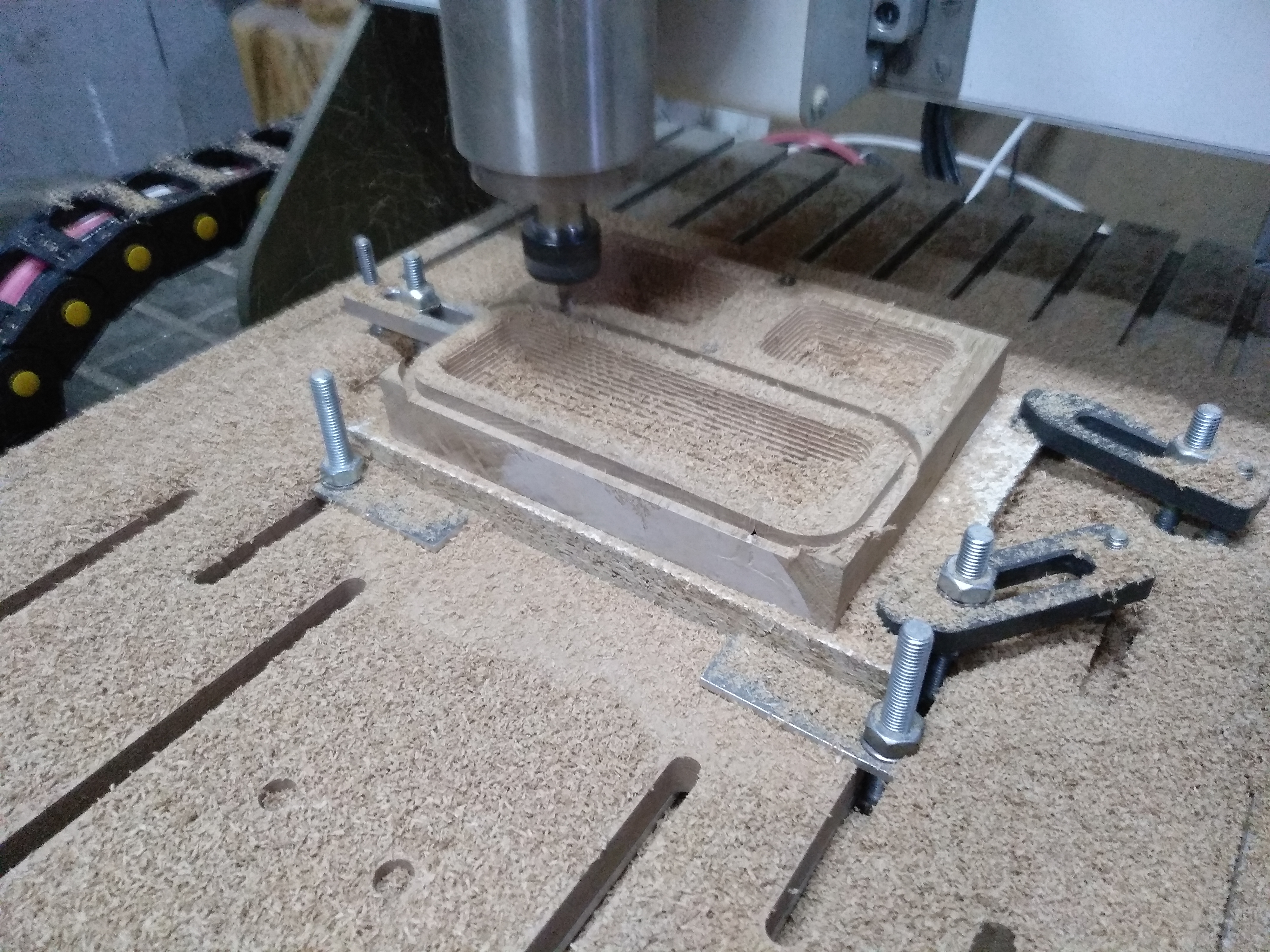 Кирилл, вот так. Заготовка крепится на ДСП шурупами. А сам ДСП прижат зажимами к столу. Не хотел дырявить стол шурупами