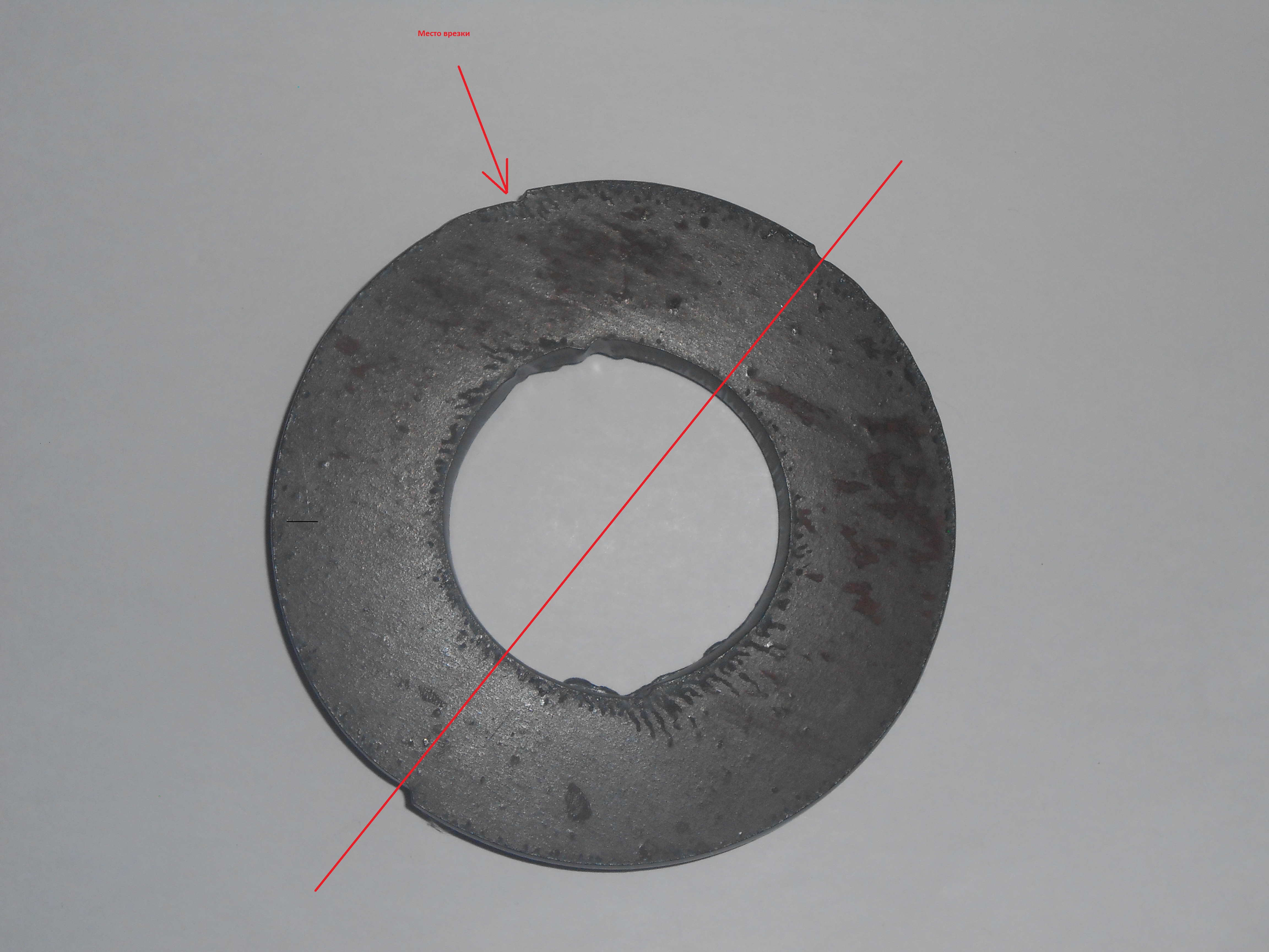 Выкладываю фото - на нем видно место врезки и деление круга на два полукруга, в момент резки визуально было видно паузу.