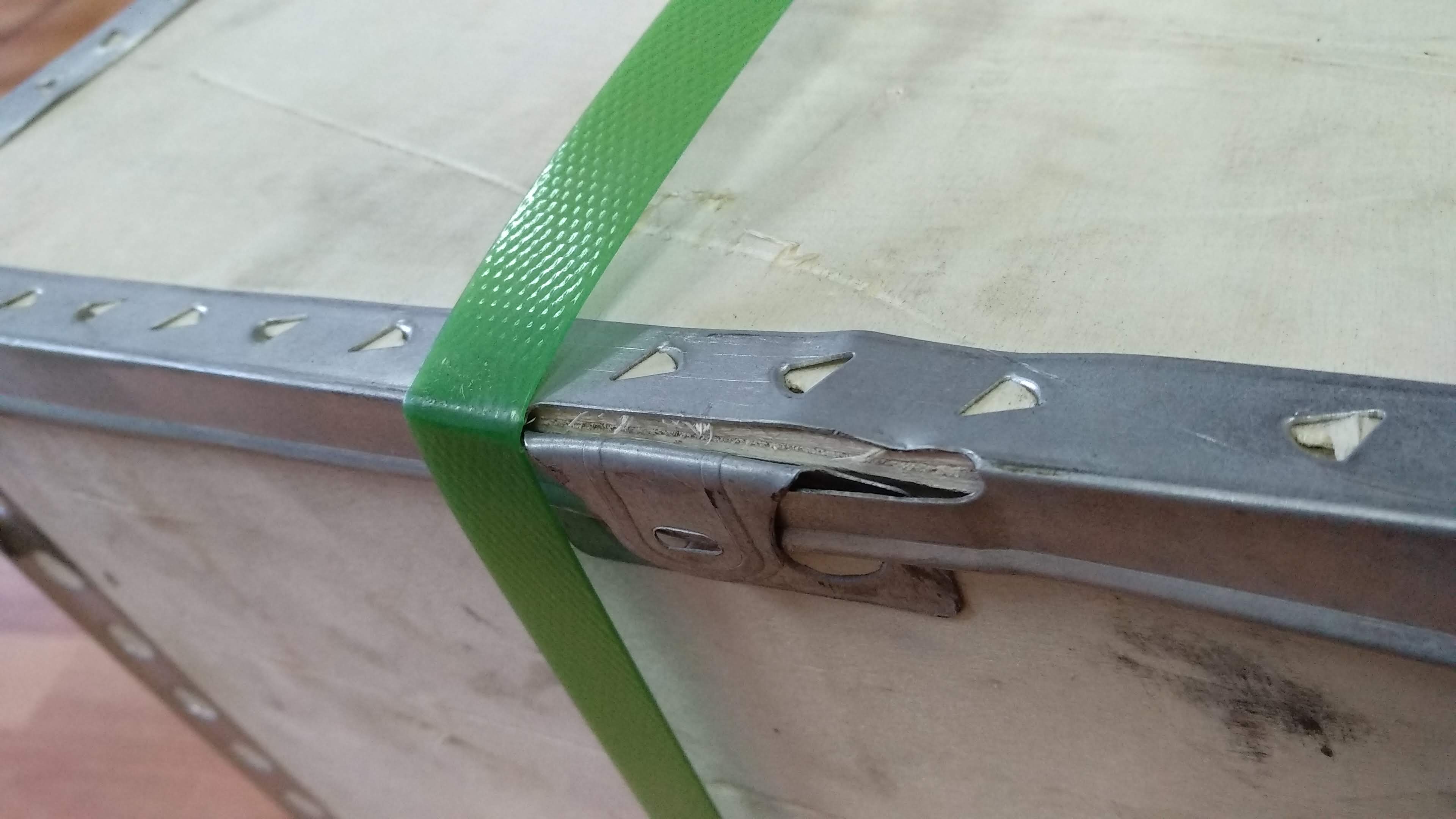 Упаковка, кстати, интересная, я такую еще не видел. Ящик из фанеры собран без шурупов, гвоздей и клея. Вот на таких уголках: