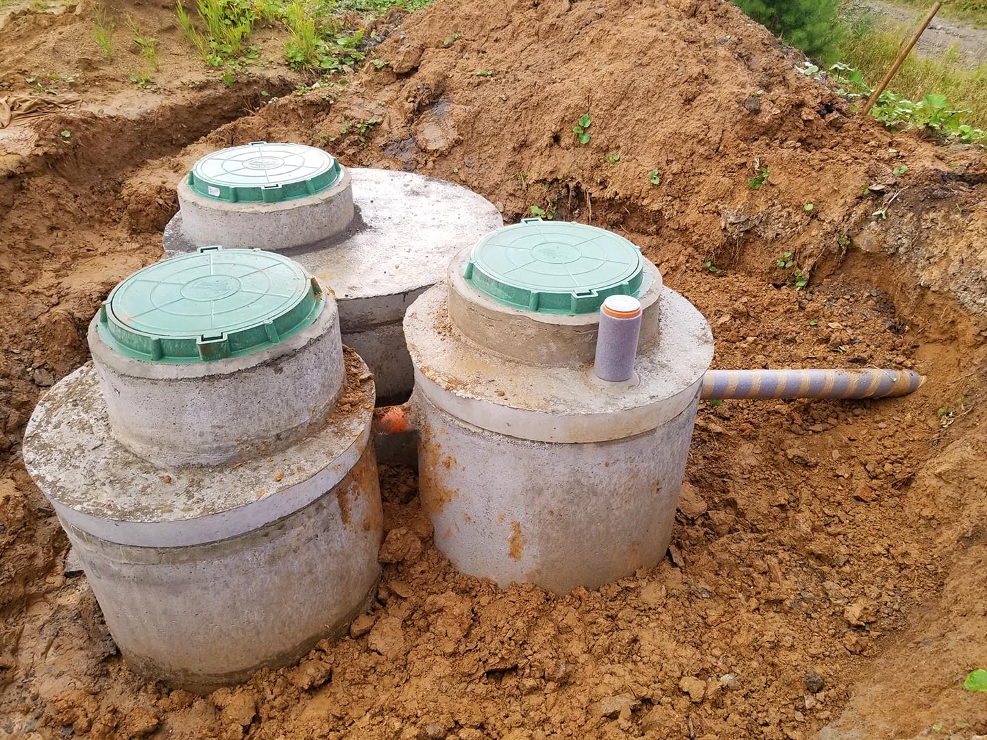 На следующий день нашел свободный манипулятор и поставил три бетонных кольца по одному на каждую "банку" (уже были куплены). Больше времени у манипулятора не было, и он меня оставил на этом этапе. К тому же поздно уже было и дождь пошел, а ему вечером в дождь работать не хотелось.