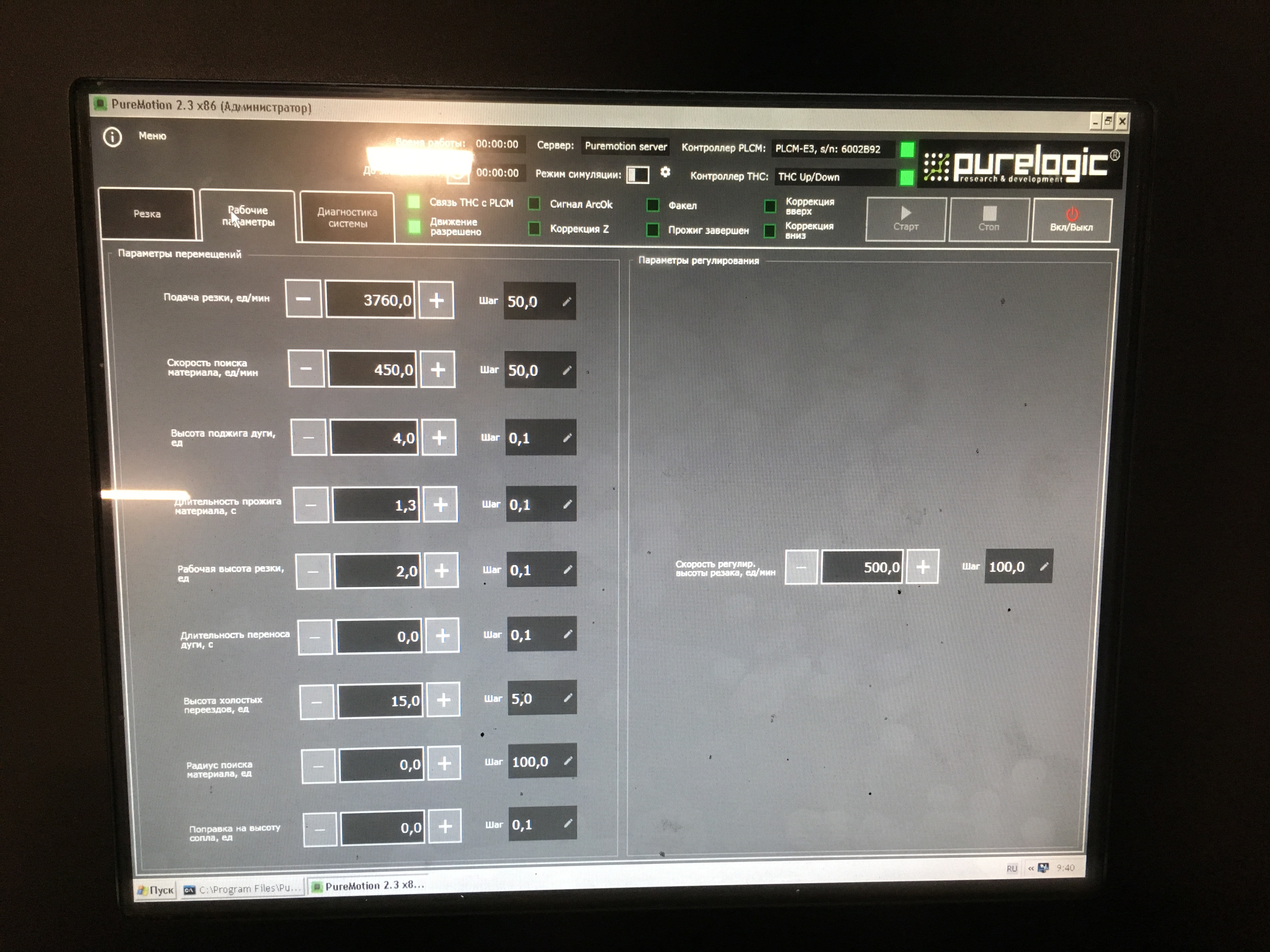 Приезжаем в точку резки N034 , далее пробинг N035, запускаем плазму N036 и плазма по какой-то причине не запускается, станок соответственно пишет, что пропал сигнал ArcOk и останавливается. Далее необходимо продолжить резку, выбираем точку начала работы, например N034 и станок начинает ехать сначала по координате Z до значения 35 и отодвигается мм на 10 по осям Х,У с черепашьей скоростью 100 ед. Далее происходит возврат в точку N035 с нормальной скоростью. В поле "желаемая скорость" стоит 6000 ед. в поле "скорость перемещений" тоже 6000 ед. Это должно быть так или я чего не углядел в настройках?