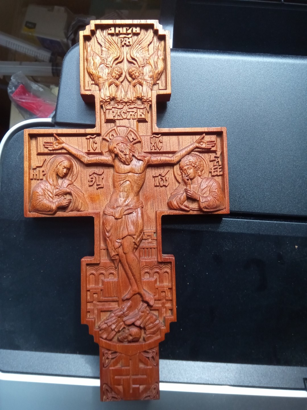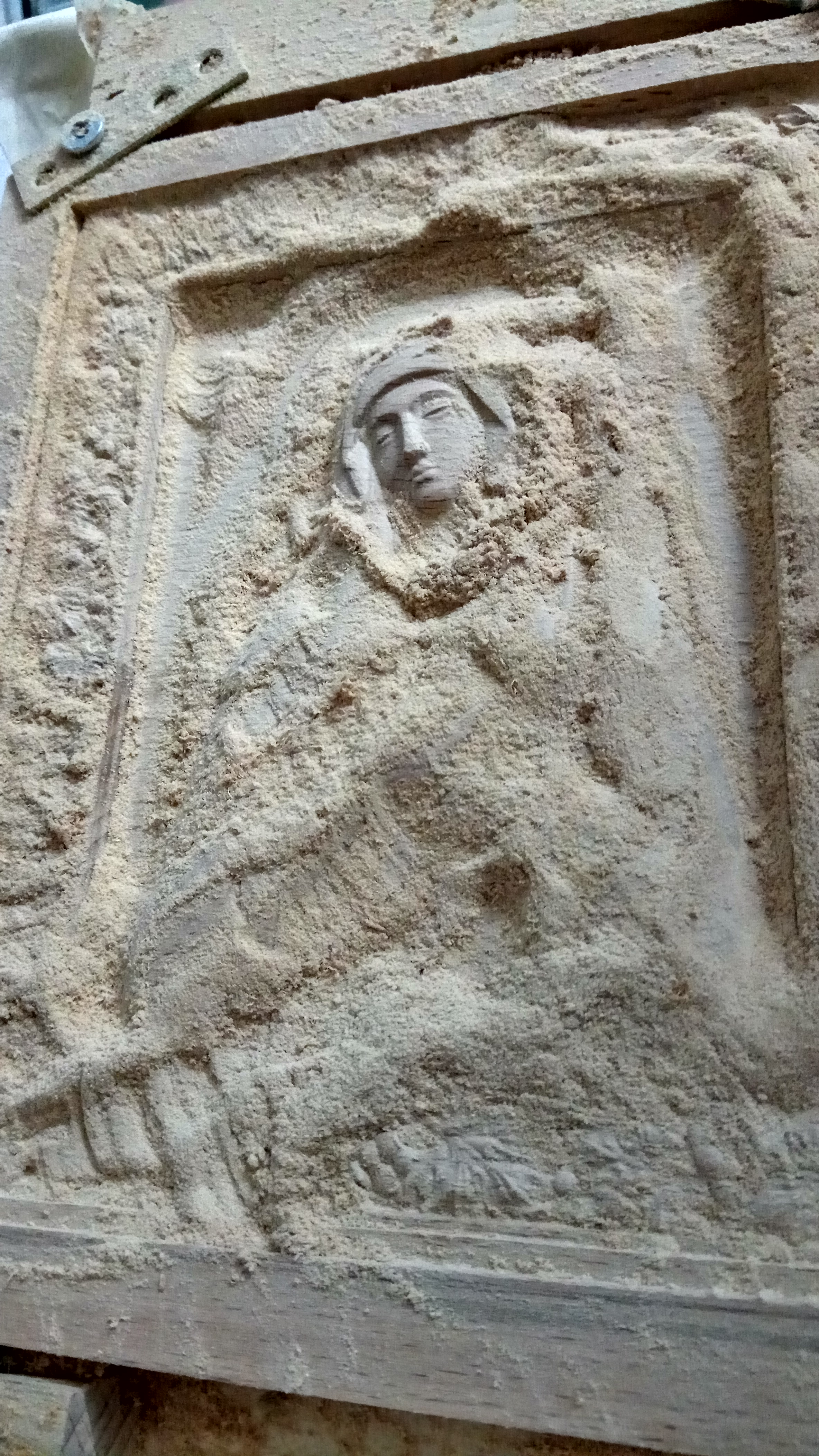 Итог: При движении по X произошел сбой не знаю чего. Можете наблюдать в правом нижнем углу иконы. От этого схватил много геморроя, т.к. уже была черновая обработка с припуском 1мм. Все равно пришлось подрабатывать наждачной бумагой в районе рук и головы образа.