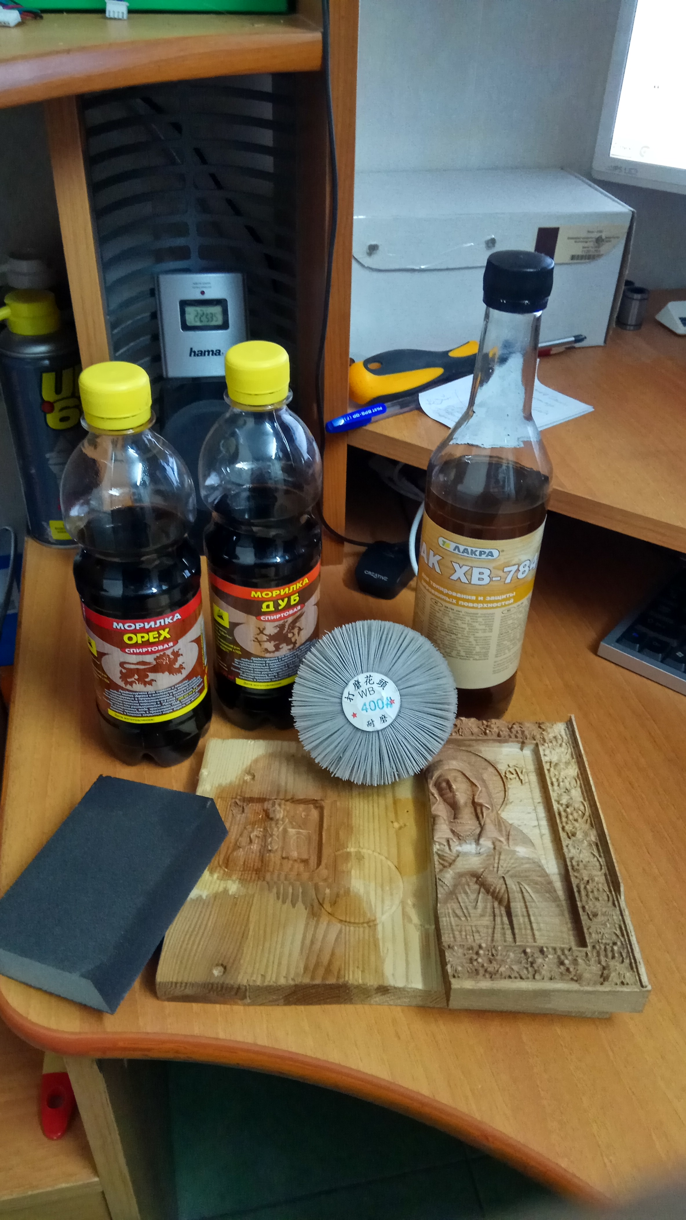9) Красим лаком, дышим глубже. Покрасил в один слой. Не знаю стоит ли красить второй. Кисть, похоже, испортил. Не разобрался чем отмывать, ацетон кончился, а сопли в кисти остались. Но переживу (https://www.castorama.ru/kist-korvus-ho ... tina-25-mm).