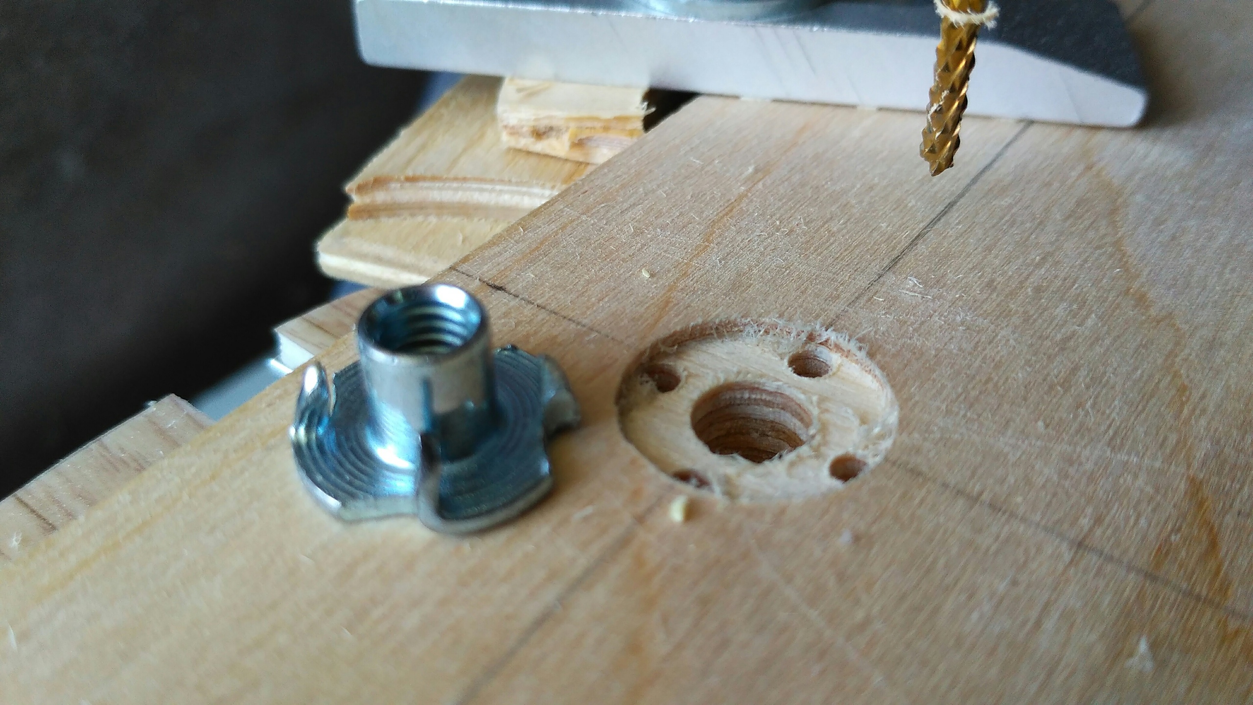 Образно накидал в кореле размеры и расположение креплений для жертвенного стола к станку (зелёным) и для забивных гаек (синим). Расчертил размеры и расположение отверстий, вырезал фанеру, на станке же отфрезеровал нужные отверстия для забивных гаек. В итоге вышло такое: Центральные 12 гаек сточил по высоте, чтобы сильнее углублялись в фанеру и в случае чего не задеть их фрезой. Для крепления к столу решил использовать следующую схему, в паз алюминиевого стола вставляется пластина (пластина для упора и чтобы не крутилась) с гайкой (гайкой вниз) и через фанеру в неё вкручиваются винты 5 мм с конусной шляпкой, вкручивал через шайбы (в шайбах предварительно высверлил конусы, чтобы сильнее утопить винты). Отверстия так же отфрезеровал на станке, оставив толщину фанеры 4,1 мм. Диаметр отверстий вышел 12,5 мм с заглубление 5,9 мм. Гайки решил припаять, заняло не так много времени. В итоге получилось как-то так: Крепежные прижимы заменю на прижимы из фанеры, т.к. прижимы из алюминия довольно скользкие и по дереву и по металлу.