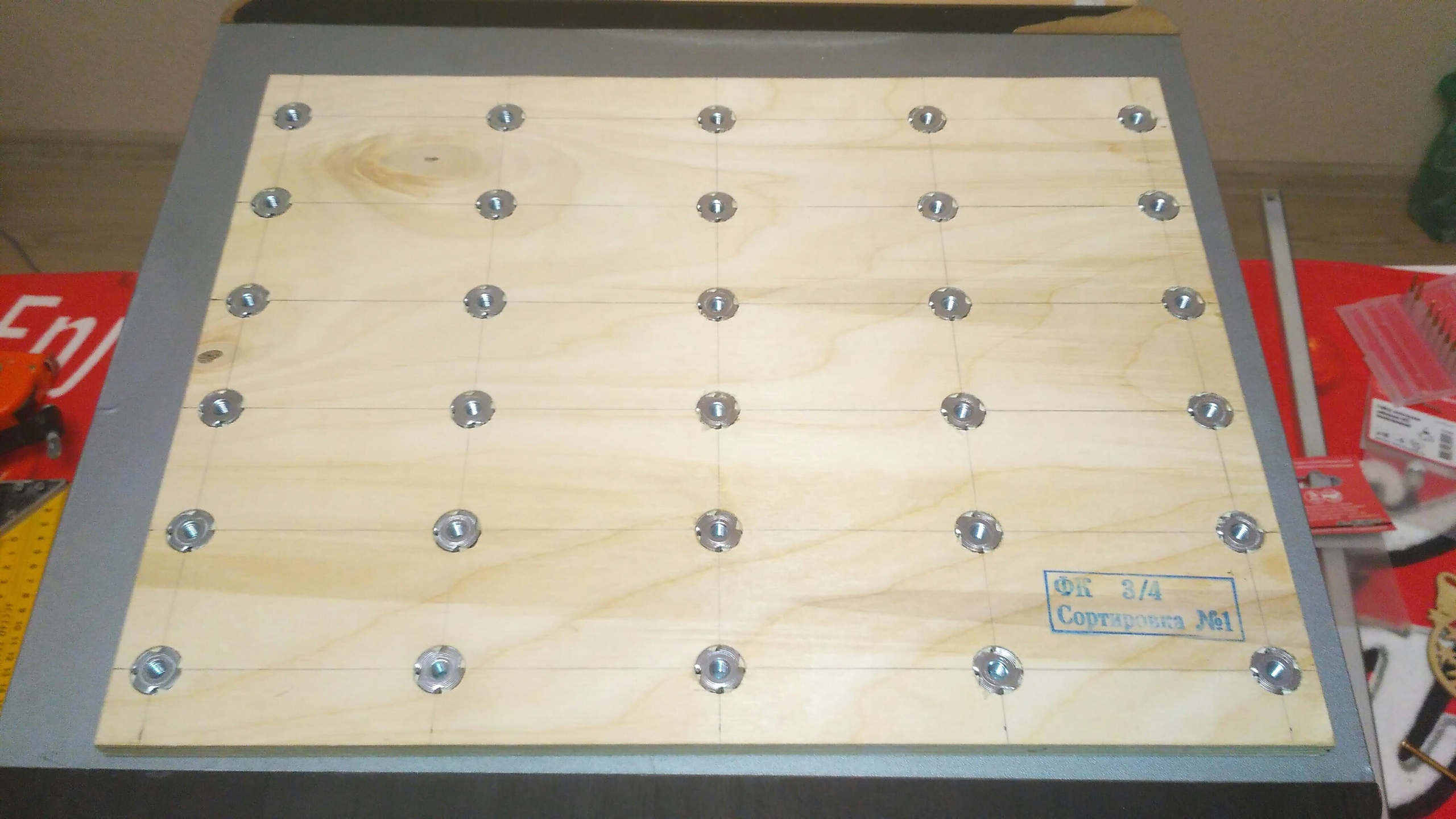 Жертвенный стол решил делать размерами 350 мм на 270 мм. Фанеру взял 10 мм шлифованную в мерлене, небольшой лист по 240 рублей. Для крепления заготовок решено было использовать мебельные забивные гайки 5 мм (их потребовалось 30 штук).